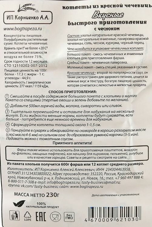 Купить Котлеты из красной чечевицы с чесноком 230 гр (ИП Корниенко А.А.) (2 шт. в наборе)