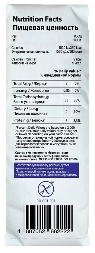| Состав | мука: рисовая, амарантовая, льняная; крахмал: тапиоковый, кукурузный, картофельный; загуститель - ксантановая камедь |