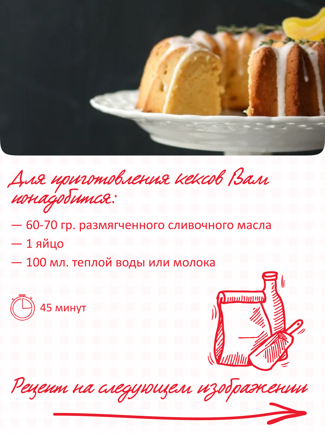 | Дополнительная информация | НЕОБХОДИМЫЕ ИНГРЕДИЕНТЫ: 60-70 г размягченного сливочного масла или маргарина, 1 яйцо, 100 мл теплой воды или молока. СПОСОБ ПРИГОТОВЛЕНИЯ: смешайте все ингредиенты до однородной массы. Выложите готовое тесто в смазанную маслом форму для кекса, заполнив ее на 3/4 высоты. Выпекайте в предварительно разогретой до 180-200 С духовке до готовности (35-45 минут). Проверьте готовность кекса деревянной палочкой. |