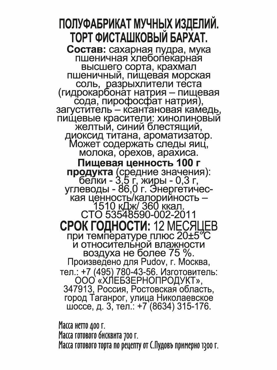 Ниже Вы можете прочитать отзывы на Смесь для выпечки Торт Фисташковый бархат С.Пудовъ, 400 г, ознакомится с подробными характеристиками, посмотреть интересные обзоры и фотографии на Смесь для выпечки Торт Фисташковый бархат С.Пудовъ, 400 г.