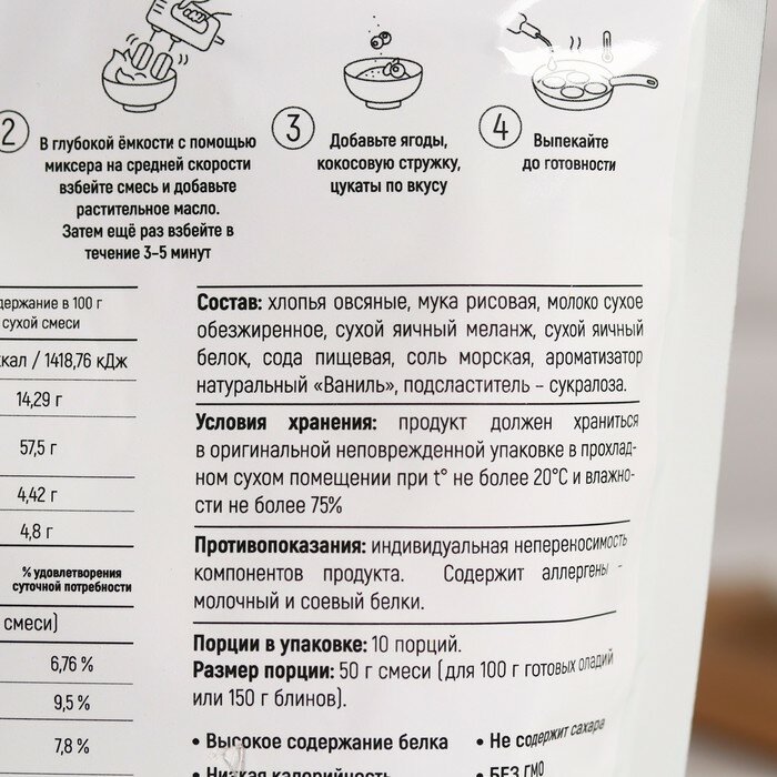 | Состав | Овсяные хлопья, яичный белок, концентрат сывороточного белка, изолят соевого белка, мука рисовая, яичный меланж сухой, сухое обезжиренное молоко, разрыхлитель, подсластитель-стевиозид, сукралоза, ароматизаторы пищевые (ваниль, йогурт) |