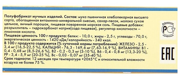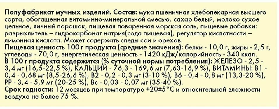 | Состав | мука пшеничная хлебопекарная в/с, обогащенная витаминно-минеральной смесью, сахар, молоко сухое цельное, яичный порошок, пищевая поваренная морская соль; пищевые добавки: разрыхлители (сода пищевая, кислота лимонная) |