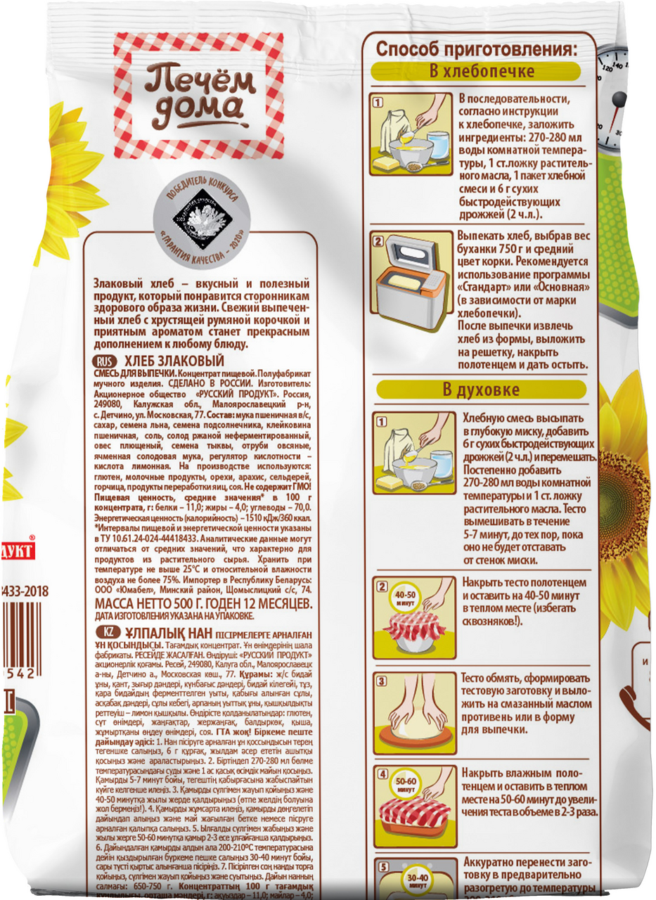 | Состав | Мука пшеничная в/с, смесь зерновая (семена подсолнечника, овес плющеный, семена тыквы, отруби пшеничные, закваска сухая), сахар, мука ржаная обдирная, соль, семена льна, клейковина пшеничная, солодовый экстракт, ячменная солодовая мука, регулятор кислотности-кислота лимонная |