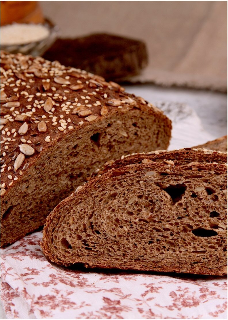 | Состав | мука пшеничная хлебопекарная первого сорта, мука ржаная обдирная, солод ржаной ферментированный, семена подсолнечника очищенные, сахар-песок, семена тыквы очищенные, семена льна, семена кунжута, семена мака, пищевая поваренная морская соль, дрожжи хлебопекарные сухие (в отдельном пакетике), пшеничная клейковина, кориандр молотый, семена тмина |
