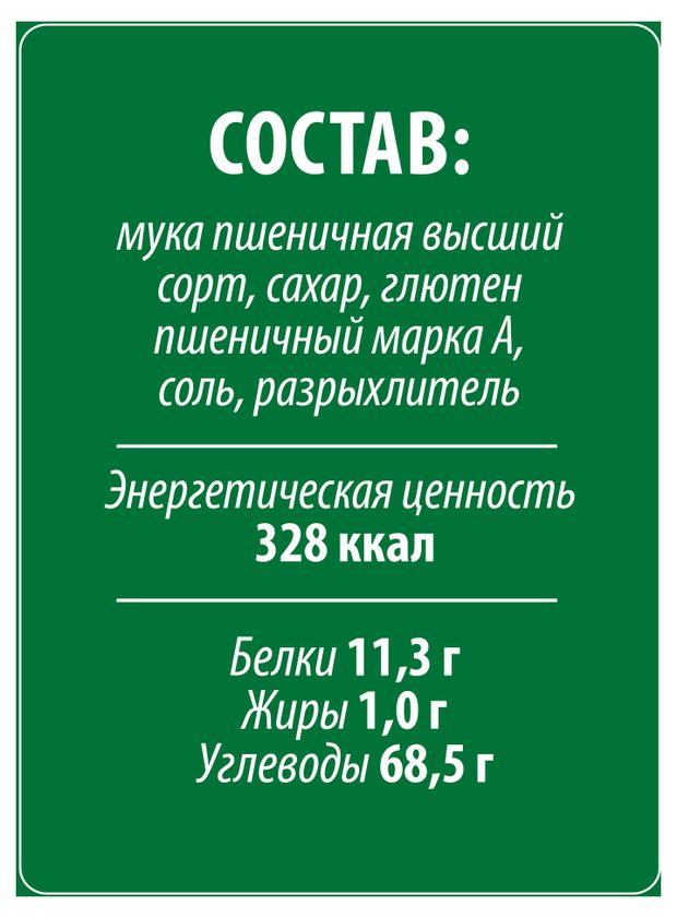 | Состав | мука из твердой пшеницы 2 сорта, мука соевая дезодорированная, сахар, соль, дрожжи |
