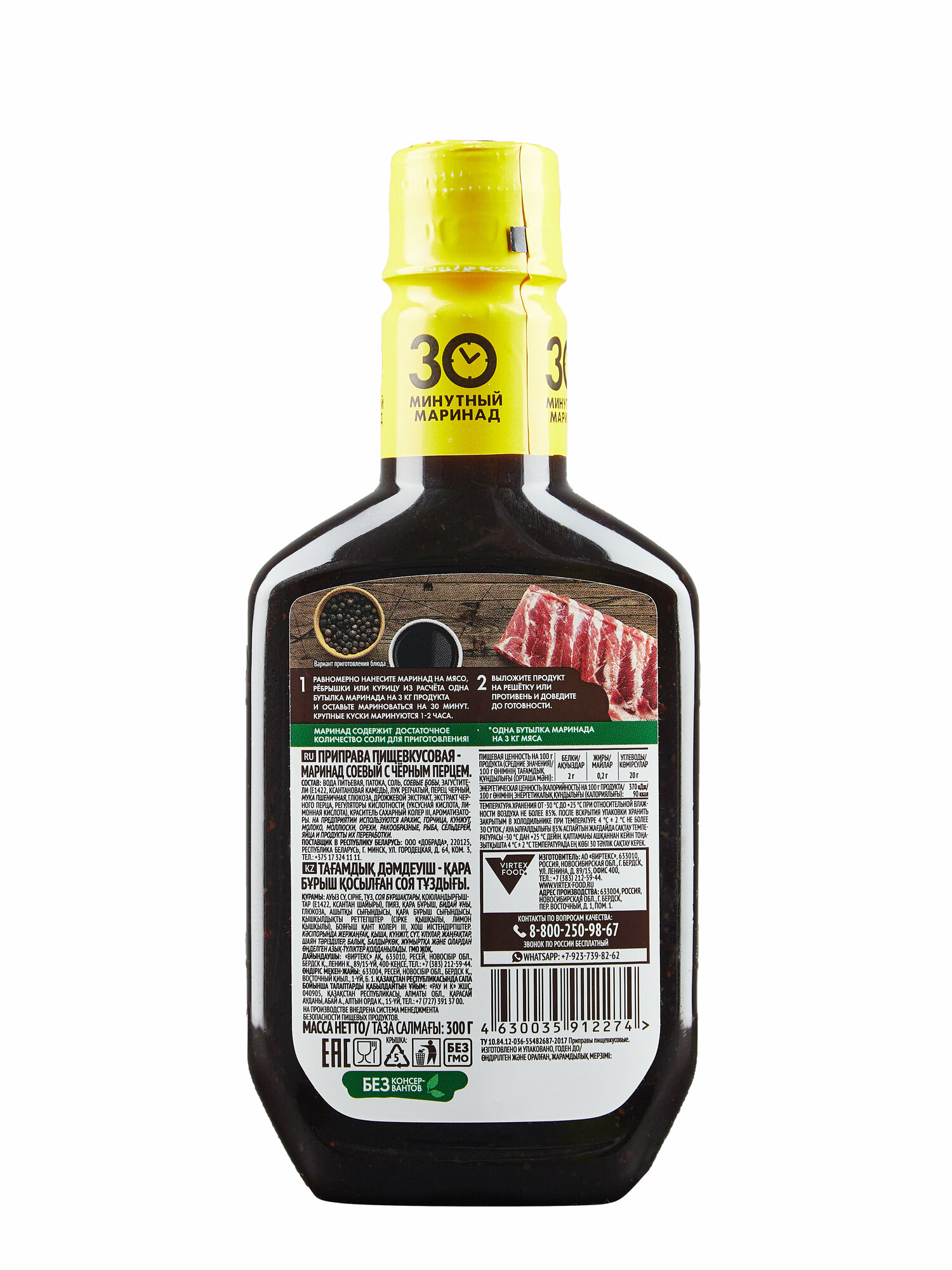 | Состав | Вода питьевая, патока, соль, соевые бобы, загустители (Е1422, ксантановая камедь), лук репчатый, перец чёрный, мука пшеничная, глюкоза, дрожжевой экстракт, экстракт чёрного перца, регуляторы кислотности (уксусная кислота, лимонная кислота), краситель сахарный колер III, ароматизаторы. |