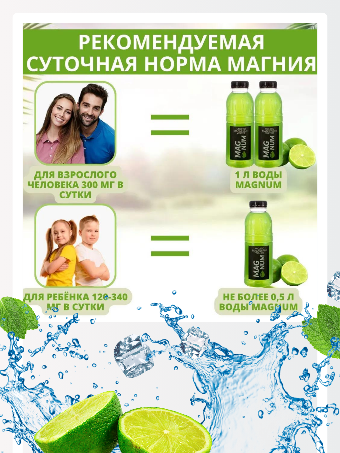 | Дополнительная информация | Среднее значение содержания магния и минералов в воде позволяет пить воду на постоянной основе, что в свою очередь ведет к улучшению качества сна; нормализует уровнь сахара в крови; улучшает работу ЖКТ; повышает уровень стрессоустойчивости; помогает облегчить депрессивные состояния; снижает уровня раздражительности. Рекомендовано пить в осенне-зимний период. Удобный формат воды для студентов, для спортсменов. |