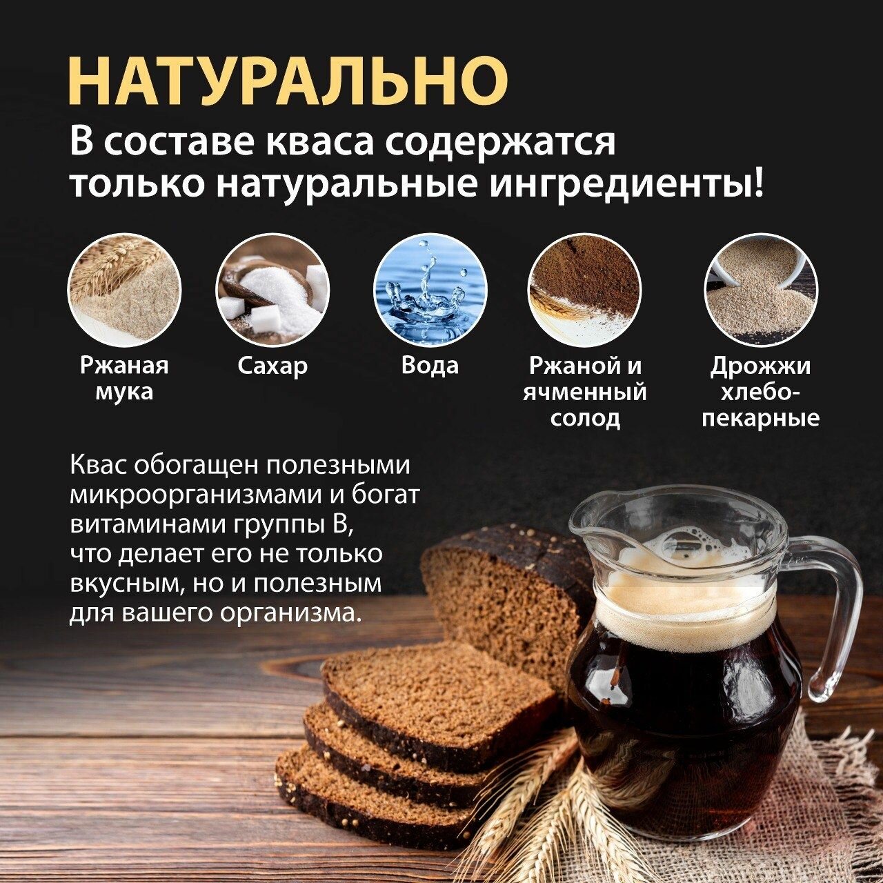 | Состав | Вода подготовленная, сахар, концентрат квасного сусла (ржаная мука, ржаной ячменный солод), кислота молочная пищевая, дрожжи хлебопекарные. |