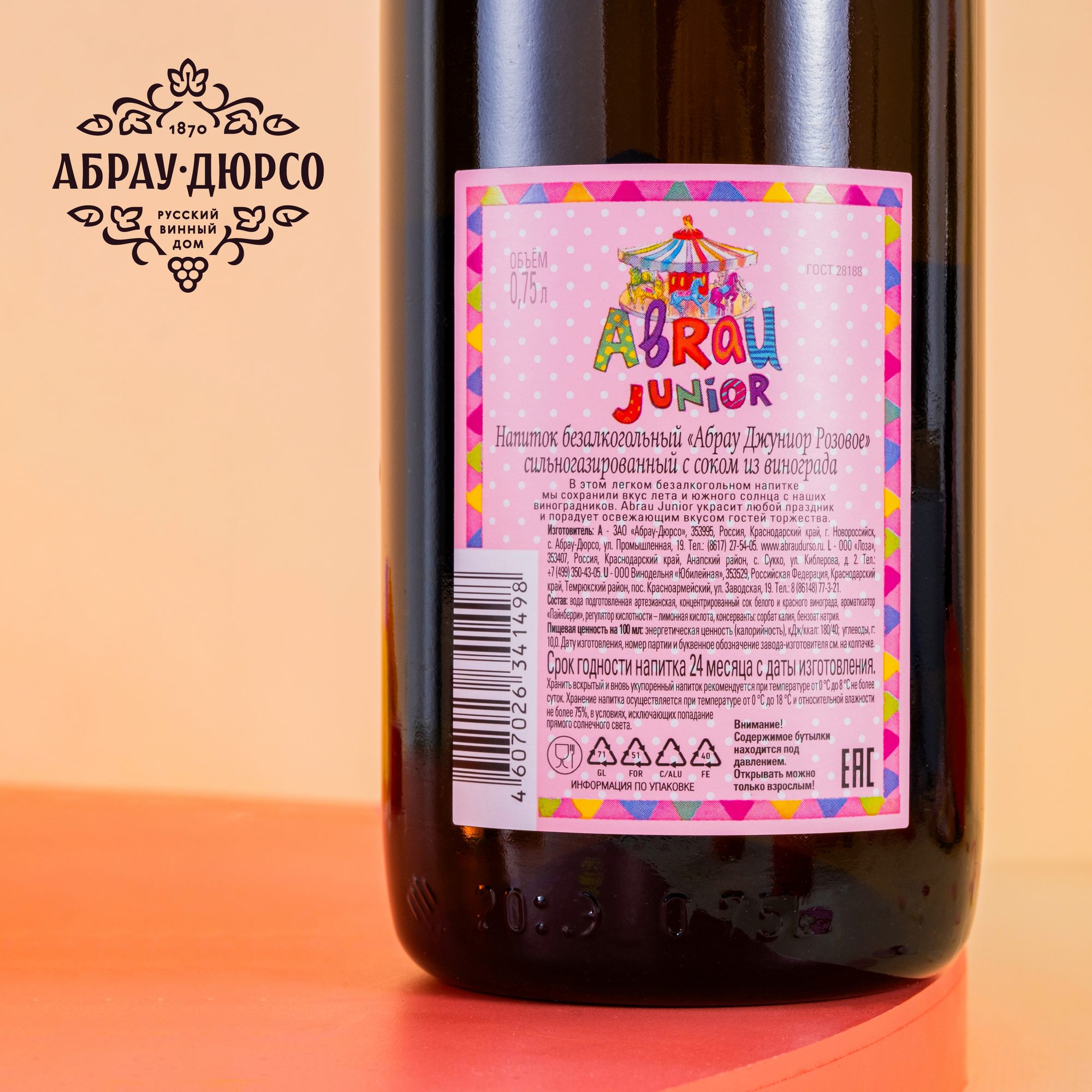 Ниже Вы можете прочитать отзывы на Напиток безалкогольный "Абрау Джуниор розовое" сильногазированный с соком из винограда 0,75 л, ознакомится с подробными характеристиками, посмотреть интересные обзоры и фотографии на Напиток безалкогольный "Абрау Джуниор розовое" сильногазированный с соком из винограда 0,75 л.
