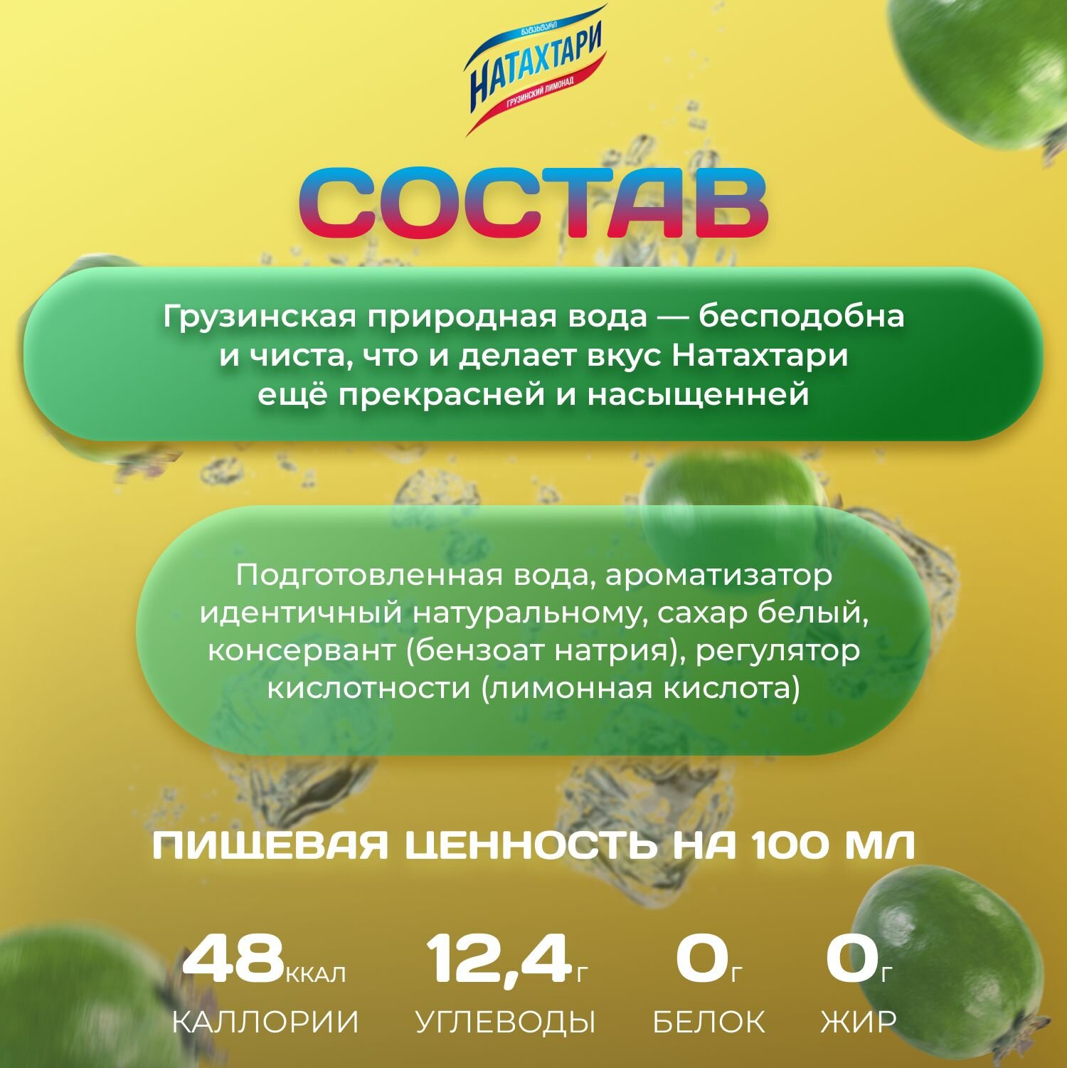 | Состав | подготовленная вода, ароматизатор фейхоа идентичный натуральному, сахар белый, консервант (бензоат натрия), регулятор кислотности (кислота лимонная), краситель (сахарный колер IV (Е150d)) |