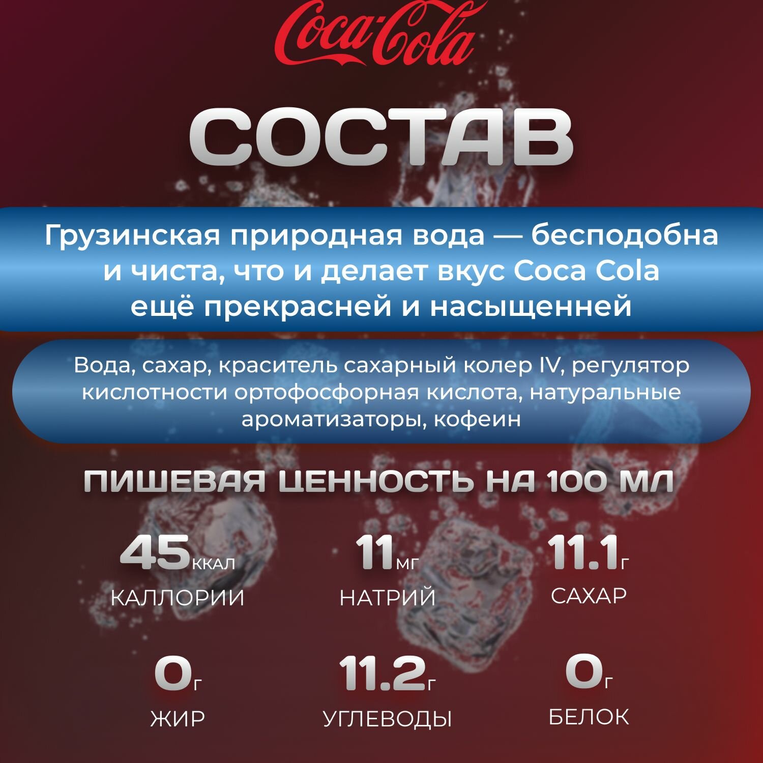 | Состав | Очищенная питьевая вода, сахар, краситель (Е150d), ароматизатор, регулятор кислотности Е338, кофеин (не более 150 мг/л), |