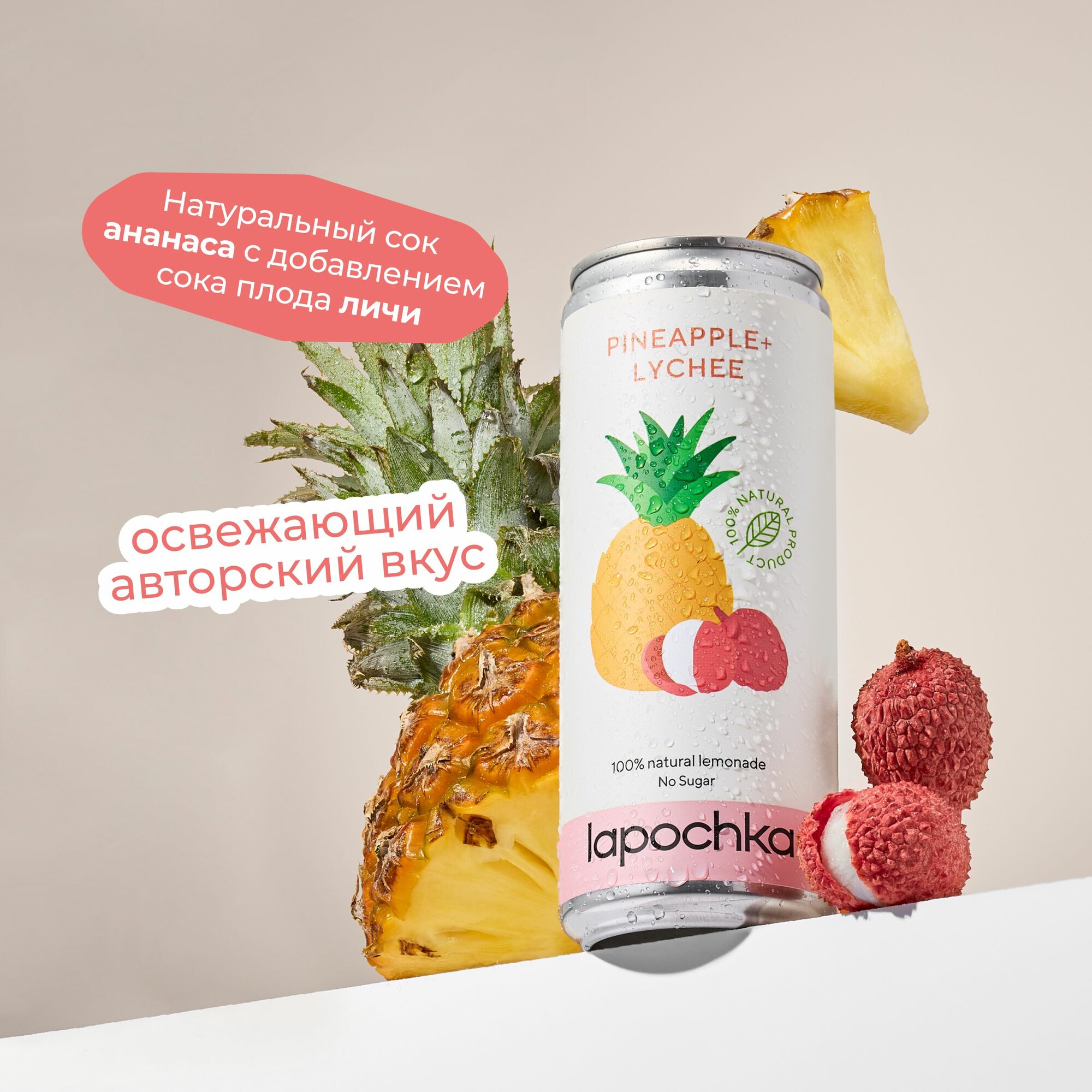 Натуральный лимонад без сахара LAPOCHKA Ананас + Личи 20 х 0,33 л