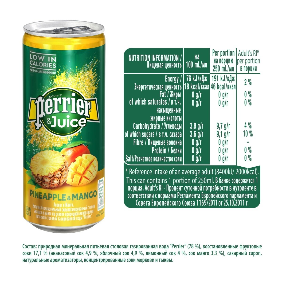 | Состав | природная минеральная питьевая столовая газированная вода "Perrier", восстановленные фруктовые соки 17,6% (ананасовый сок 4,9%, яблочный сок 4,9%, лимонный сок 4,5%, сок манго 3,3%), сахарный сироп, натуральные ароматизаторы, концентрированные соки моркови и тыквы |