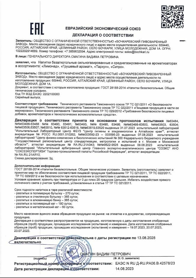 | Дополнительная информация | Хранить в сухом месте. Избегать воздействия прямого солнечного света. После вскрытия снижается содержание диоксида углерода, вскрытую упаковку хранить в холодильнике не более суток. |