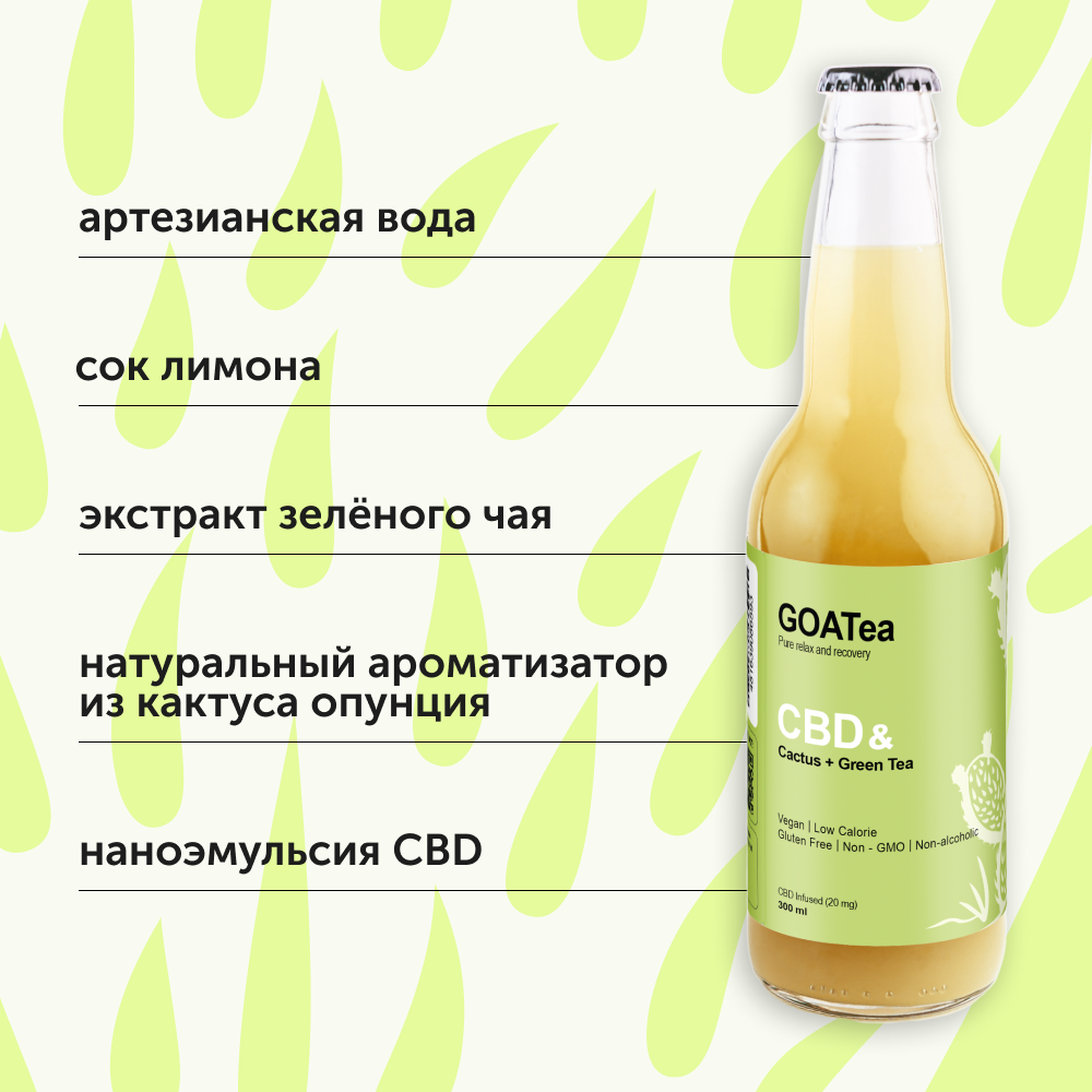 | Состав | Вода артезианская специально подготовленная, сок лимона концентрированный, фруктоза, экстракт зелёного чая, натуральный ароматизатор Кактус опунция, наноэмульсия CBD, сорбат калия, бензоат натрия. |