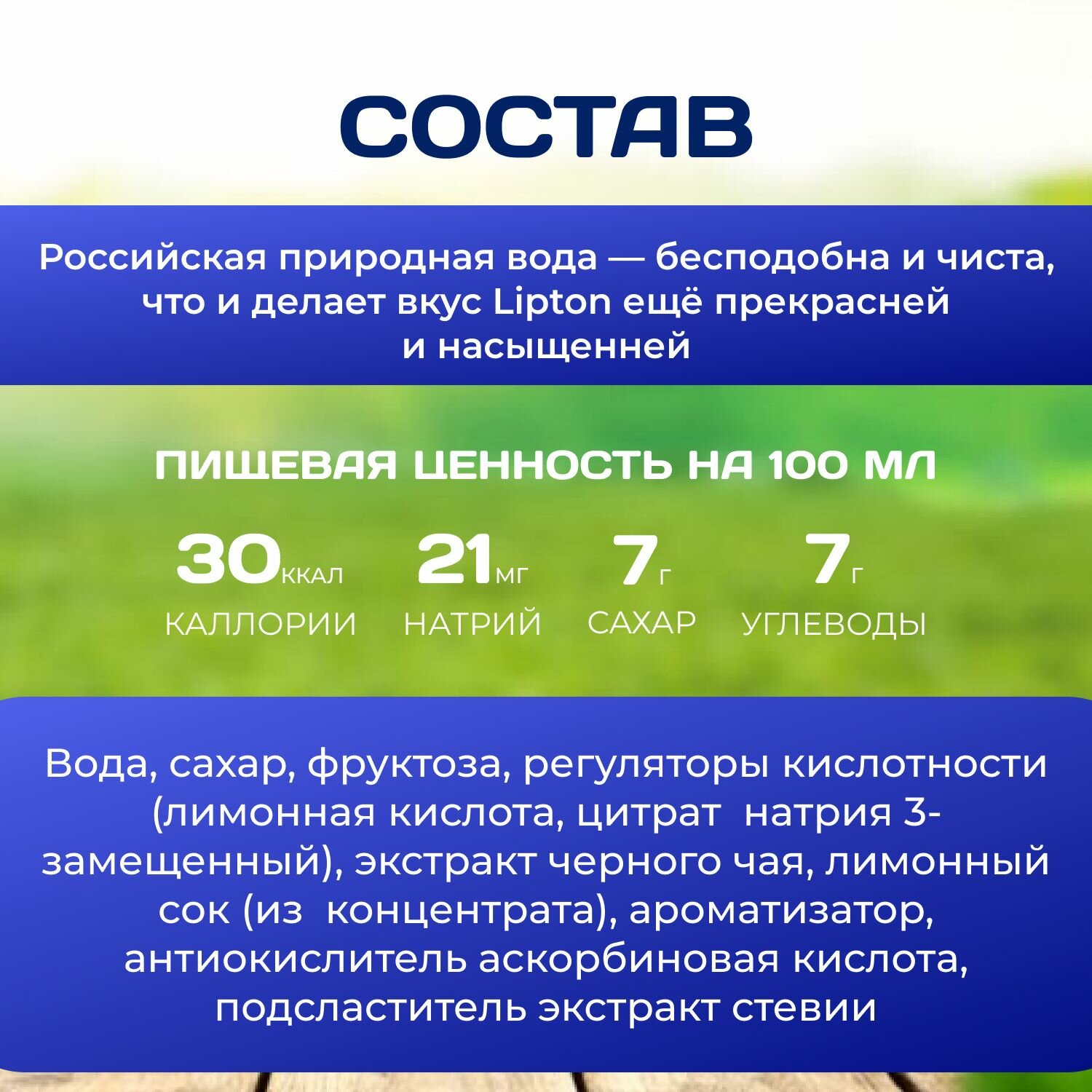 | Состав | Вода, сахар, регуляторы кислотности (лимонная кислота, цитрат натрия 3-замещенный), экстракт черного чая, концентрированный лимонный сок, ароматизатор, антиокислитель аскорбиновая кислота, подсластитель - натуральный экстракт стевии. |