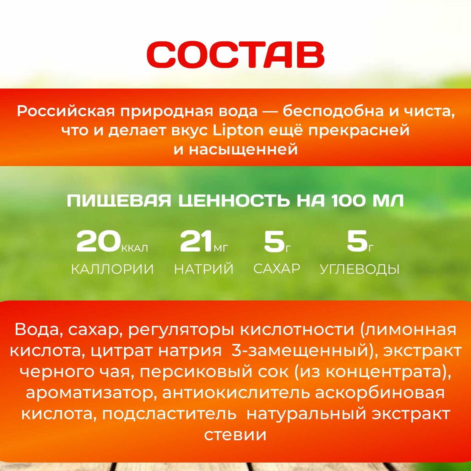 | Состав | Вода, сахар, регуляторы кислотности (лимонная кислота, цитрат натрия 3-замещенный), экстракт черного чая, концентрированный лимонный сок, ароматизатор, антиокислитель аскорбиновая кислота, подсластитель - натуральный экстракт стевии. |