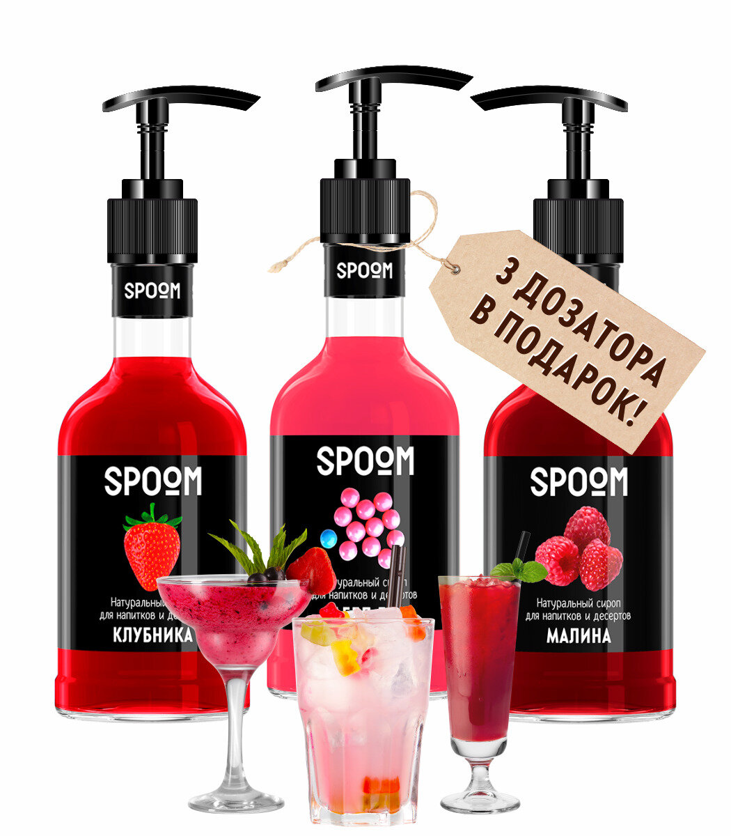 Купить Набор сиропов Spoom №14 для коктейлей и лимонадов "Клубника", "Баббл гам", "Малина" в фирменной упаковке (3 шт по 250 мл) + 3 дозатора
