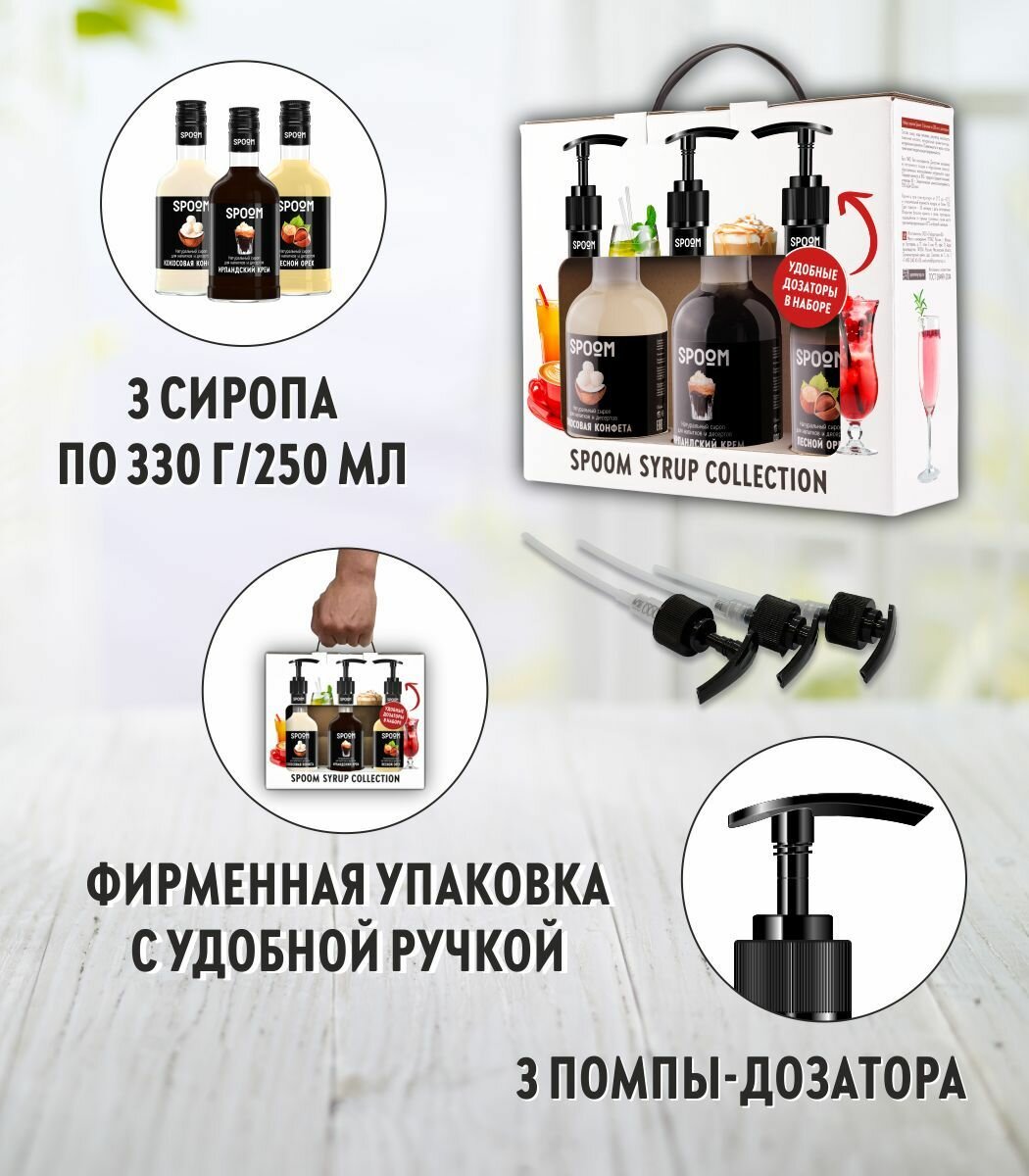 Купить Набор сиропов Spoom №20 для кофе Кокосовая конфета, Ирландский крем, Лесной орех в фирменной упаковке (3 шт по 330 г / 250 мл) + 3 дозатора в подарок