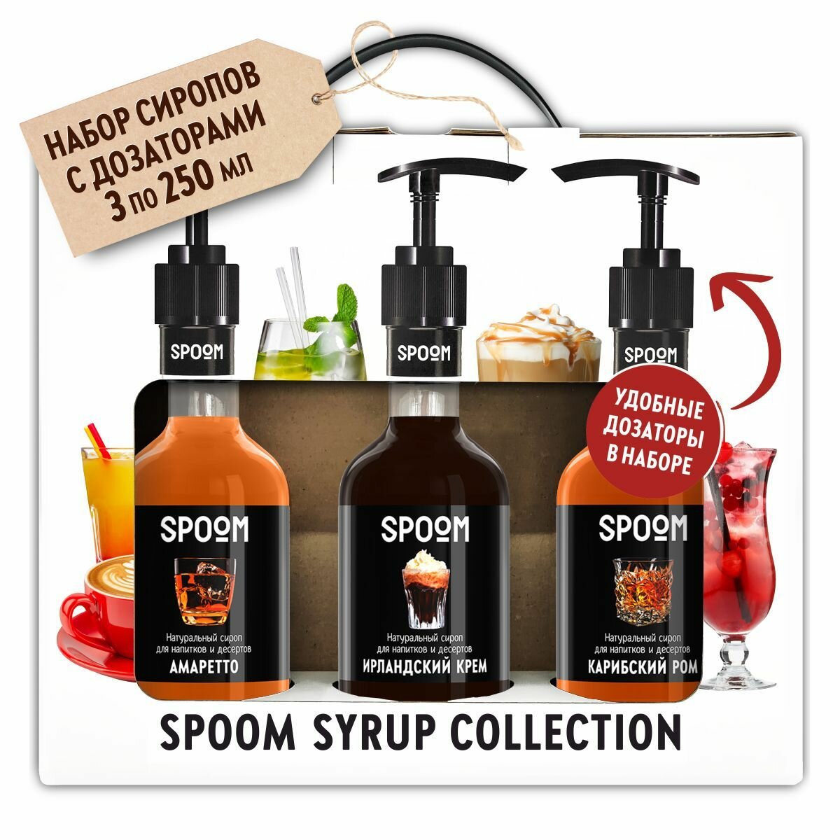 Набор сиропов Spoom №13 для кофе Амаретто, Ирландский крем, Карибский ром в фирменной упаковке (3 шт по 330 г / 250 мл) + 3 дозатора в подарок