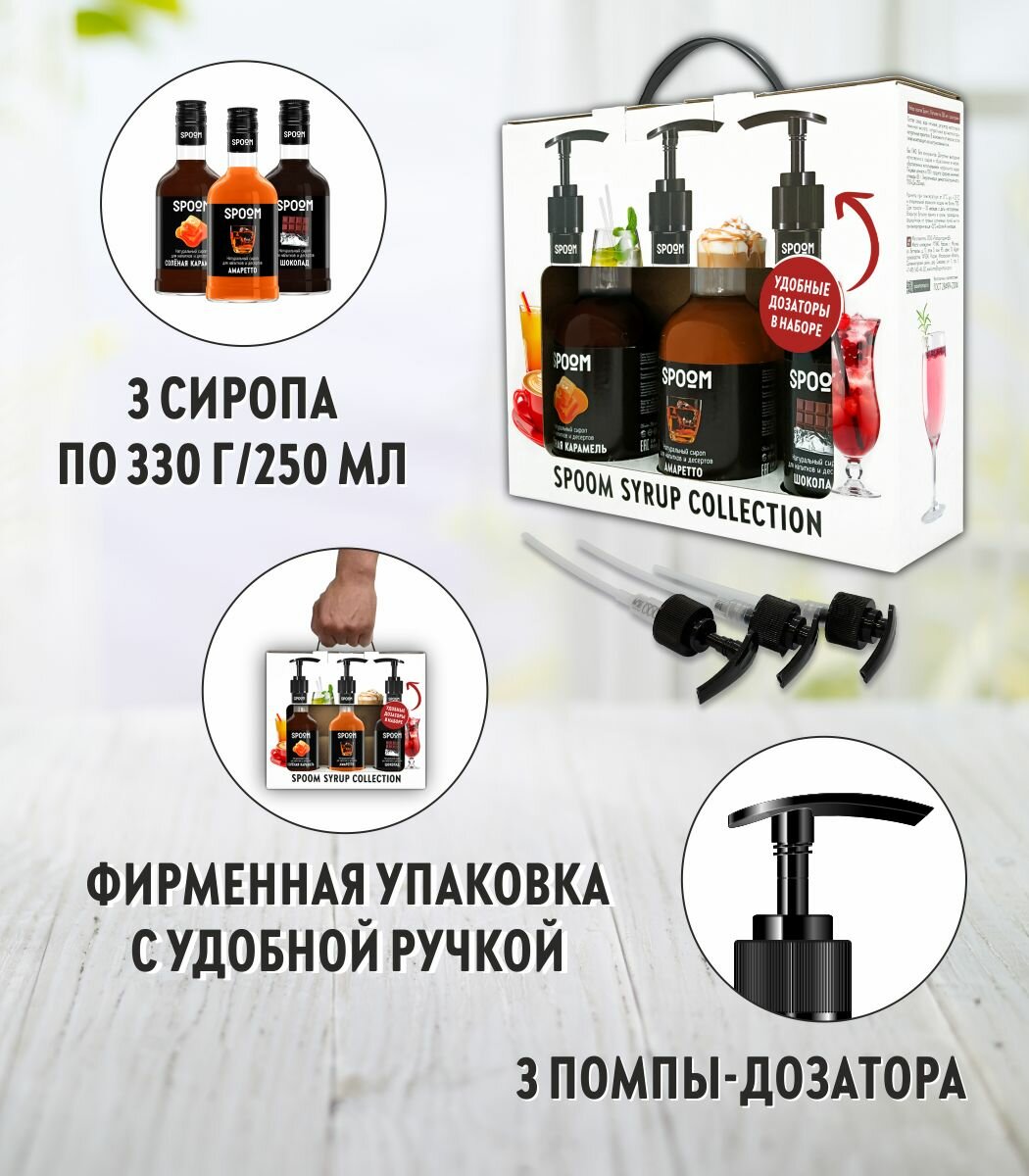 Купить Набор сиропов Spoom №15 для кофе Соленая карамель, Амаретто, Шоколад в фирменной упаковке (3 шт по 330 г / 250 мл) + 3 дозатора в подарок