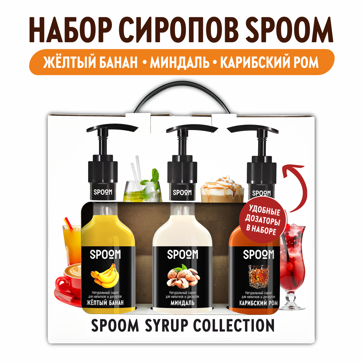 Купить Набор сиропов SPOOM №4 для кофе Банан желтый, Миндаль, Карибский ром в фирменной упаковке (3 шт по 250 мл) + 3 дозатора в подарок
