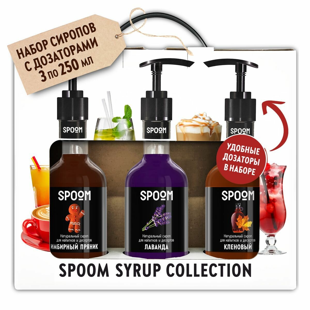 Купить Набор сиропов SPOOM №8 для кофе Имбирный пряник, Лаванда, Кленовый в фирменной упаковке (3 шт по 250 мл) + 3 дозатора в подарок