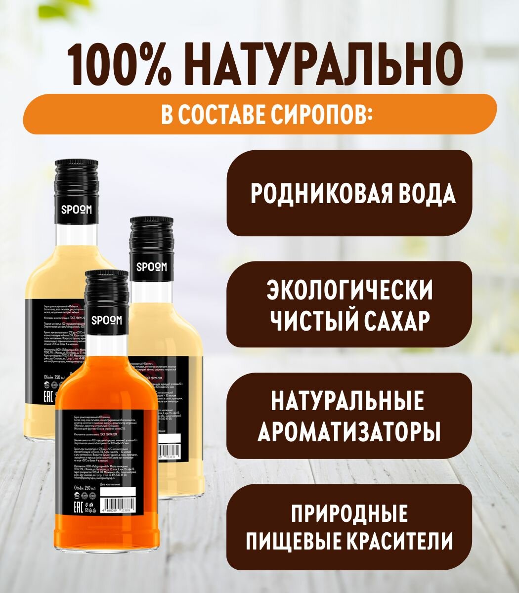 | Состав | Cироп Spoom "Ирландский крем", 250 мл: сахар, вода питьевая, регулятор кислотности лимонная кислота, ароматизатор натуральный «Ирландский крем», краситель натуральный «Карамельный колер»; Cироп Spoom "Французская карамель", 250 мл: сахар, вода питьевая, регулятор кислотности лимонная кислота, ароматизатор натуральный «Карамель», краситель натуральный «Карамельный колер»; Cироп Spoom "Макадамия", 250 мл: сахар, вода питьевая, регулятор кислотности лимонная кислота, ароматизатор натуральный «Макадамия», краситель натуральный «Карамельный колер»; |