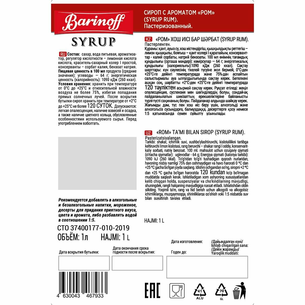 Купить Сироп Barinoff Ром (для кофе, коктейлей, десертов, лимонада и мороженого), 1л