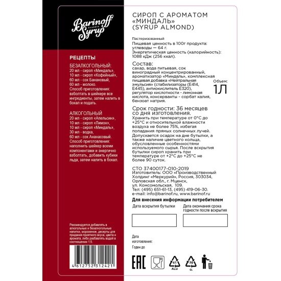 Ниже Вы можете прочитать отзывы на Сироп Миндаль 1л 6878076, ознакомится с подробными характеристиками, посмотреть интересные обзоры и фотографии на Сироп Миндаль 1л 6878076.