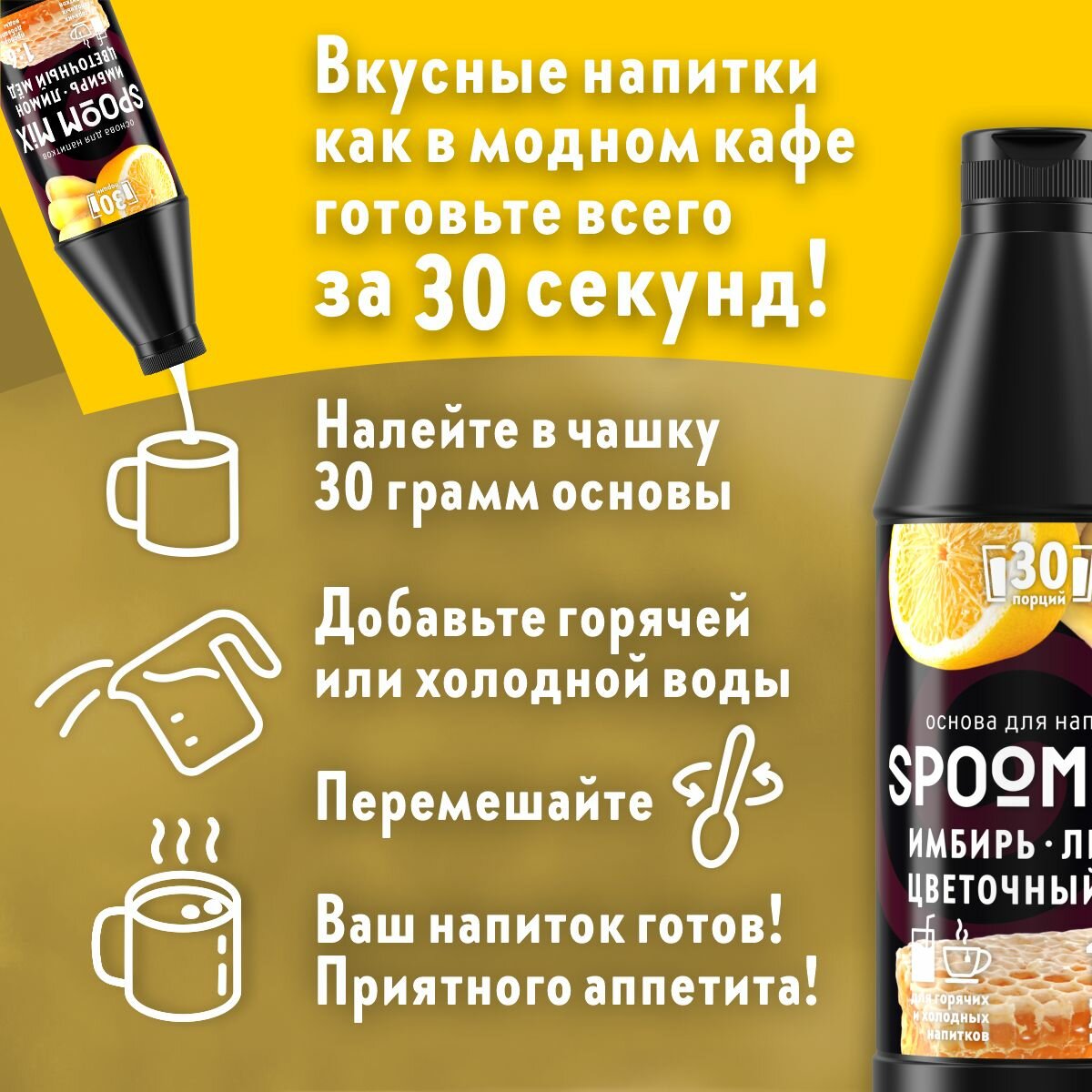 СохранитьОснова для напитков SPOOM MIX Имбирь, лимон, цветочный мёд, бутылка 1 кг интересное: