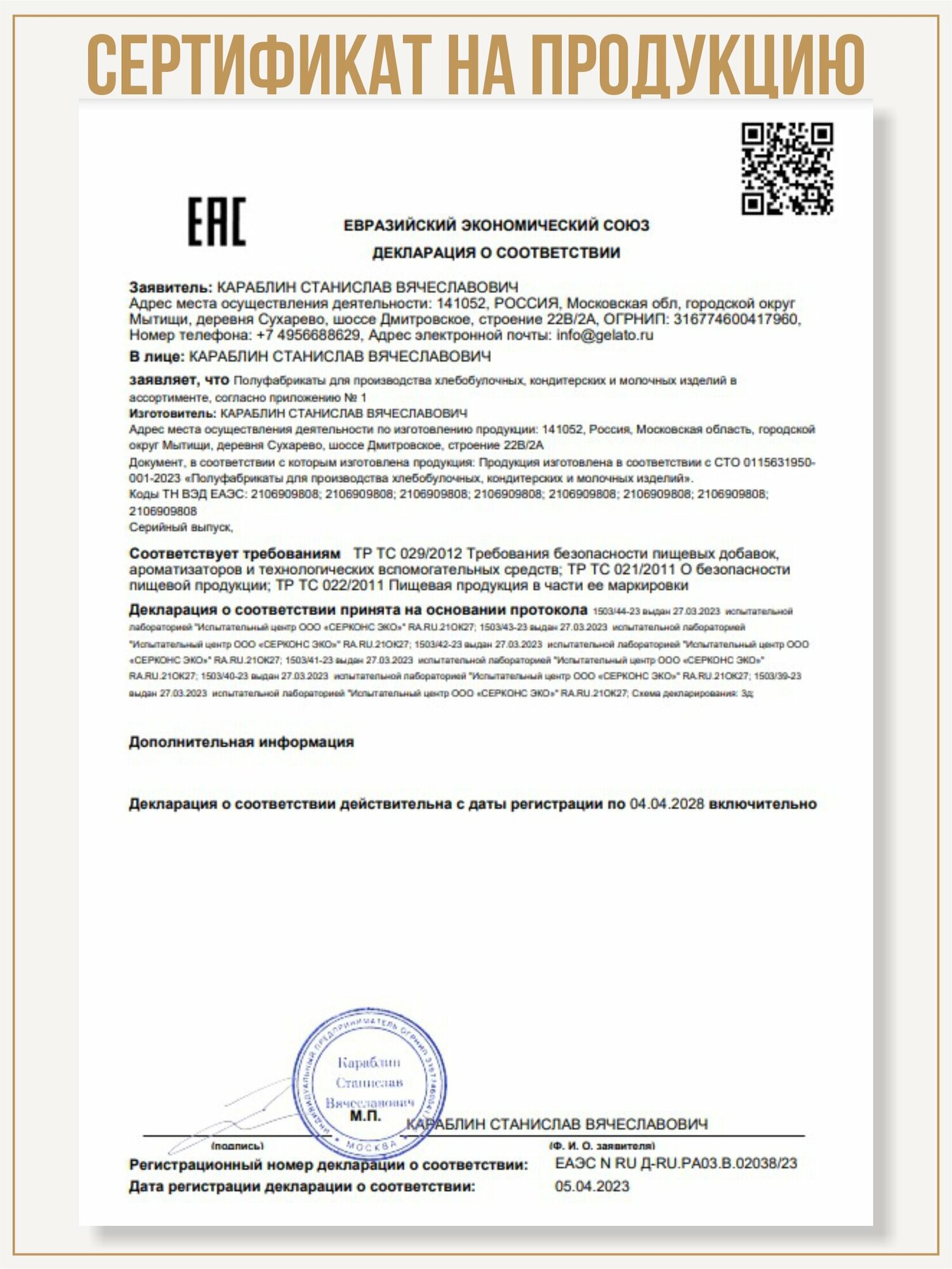 | Стандарты производства | Россия |