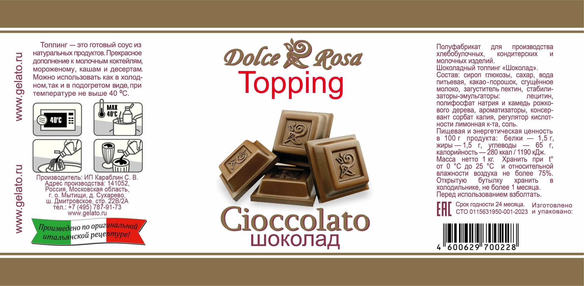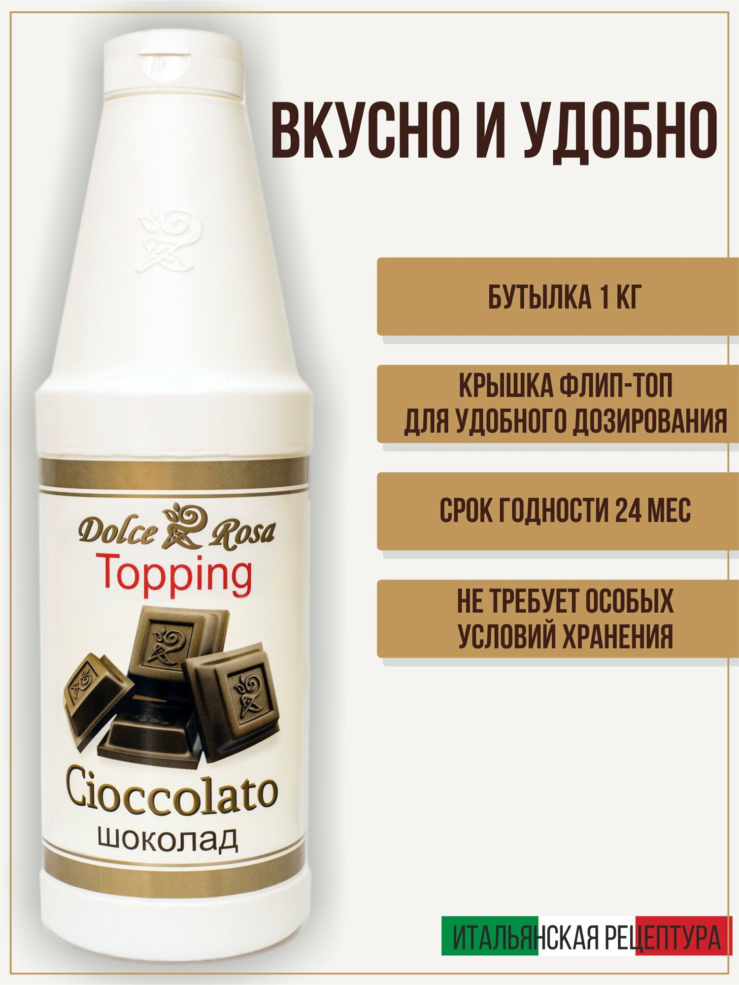 Топпинг Dolce Rosa Шоколад, (Cioccolato) натуральный для мороженого, для кофе, для десертов, для выпечки, для коктейлей, 1 кг