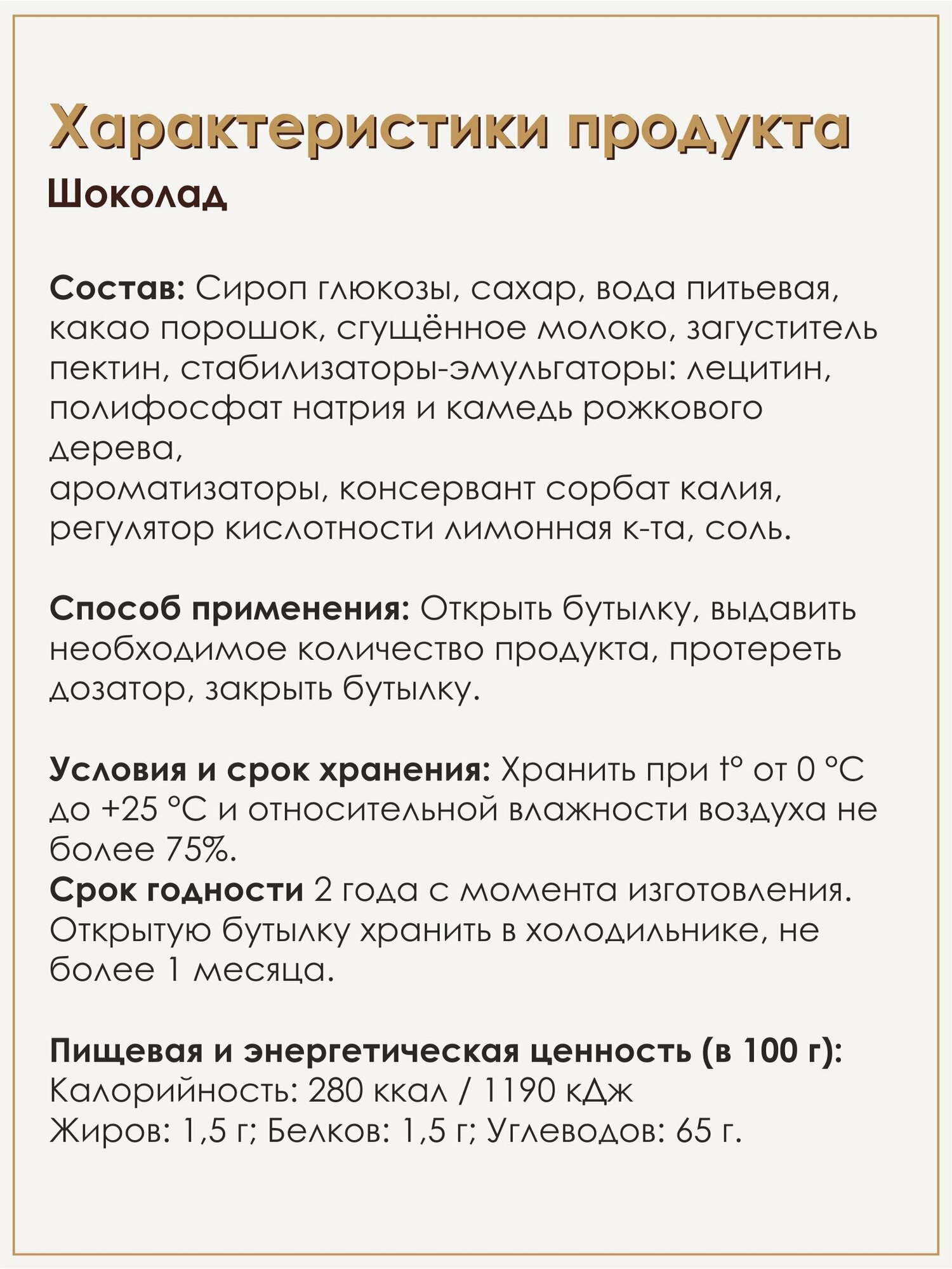 | Состав | Сироп глюкозы, сахар, вода питьевая, какао порошок, сгущённое молоко, загуститель пектин, стабилизаторы-эмульгаторы: лецитин, полифосфат натрия и камедь рожкового дерева, ароматизаторы, консервант сорбат калия, регулятор кислотности лимонная к-та, соль |