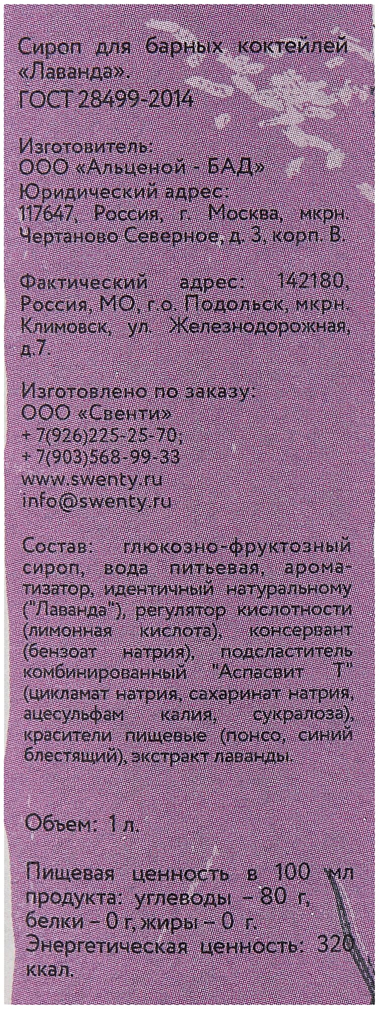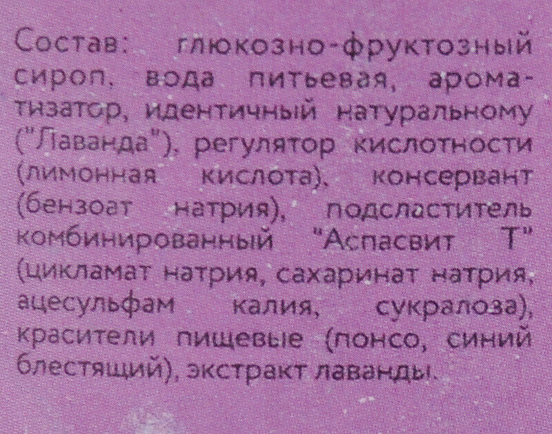 | Состав | глюкозно-фруктозный сироп, вода питьевая, ароматизатор, идентичный натуральному "Лаванда", регулятор кислотности (лимонная кислота), консервант (бензоат натрия), подсластитель комбинированный "Аспасвит Т" (цикламат натрия, сахаринат натрия, ацесульфам калия, сукралоза), красители пищевые (понсо, синий блестящий), экстракт лаванды |
