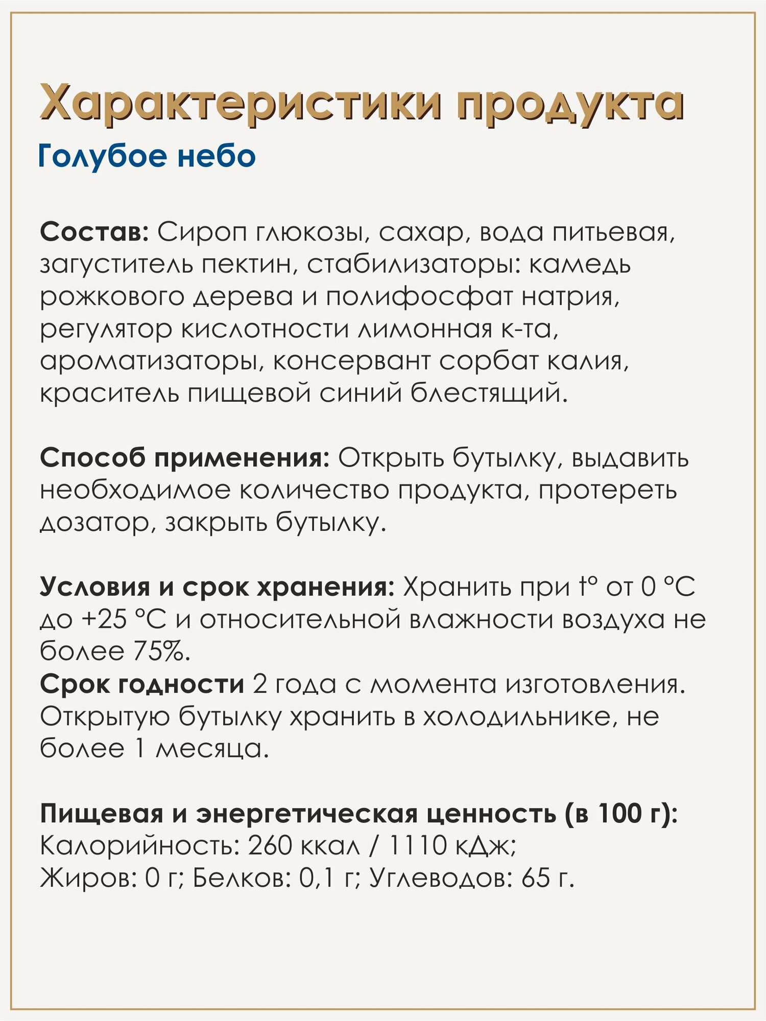 | Состав | Сироп глюкозы, сахар, вода питьевая, загуститель пектин, стабилизаторы: камедь рожкового дерева и полифосфат натрия, регулятор кислотности лимонная к-та, ароматизаторы, консервант сорбат калия, краситель пищевой синий блестящий. |