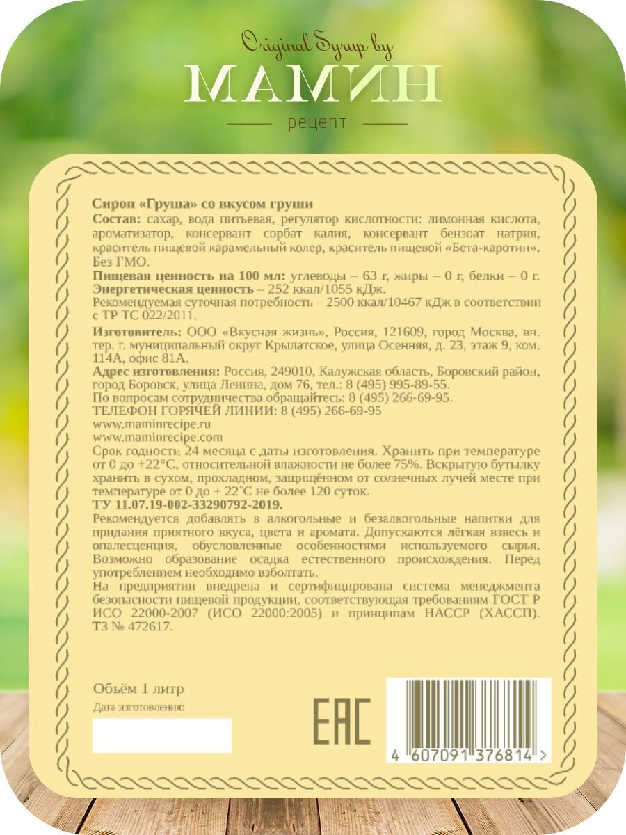 СохранитьСироп Груша мамин рецепт для кофе и коктейлей 1л, ПЭТ. интересное: