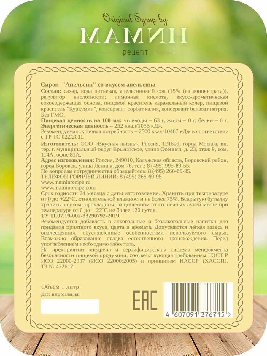 СохранитьСироп Апельсин мамин рецепт для кофе и коктейлей 1л, ПЭТ. интересное: