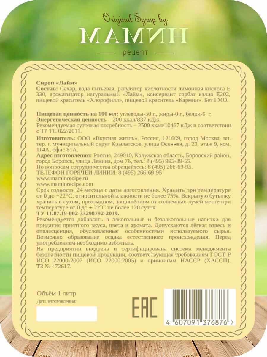 СохранитьСироп Лайм мамин рецепт для кофе и коктейлей 1л, ПЭТ. интересное: