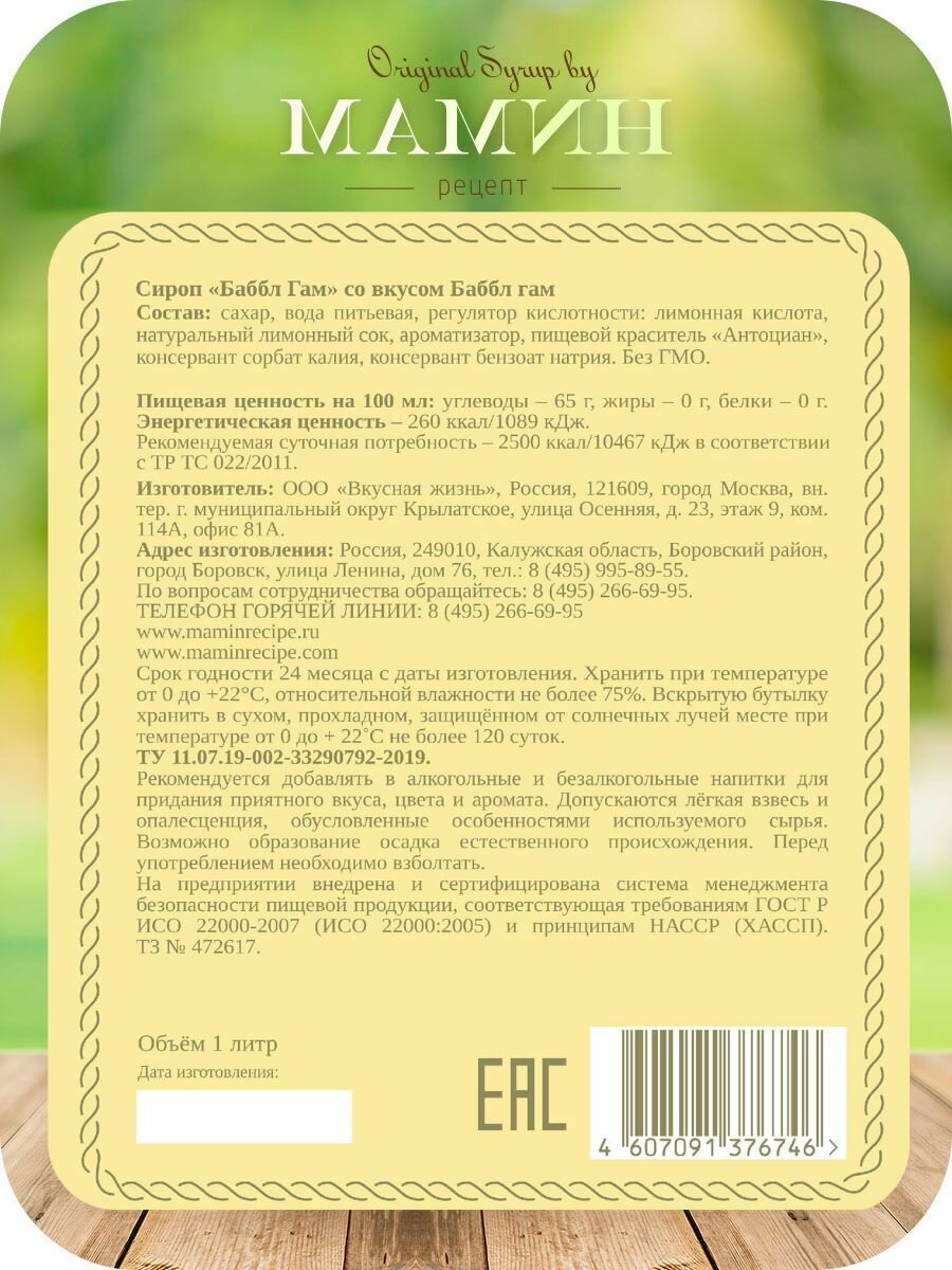 СохранитьСироп Бабл Гам мамин рецепт для кофе и коктейлей 1л, ПЭТ. интересное: