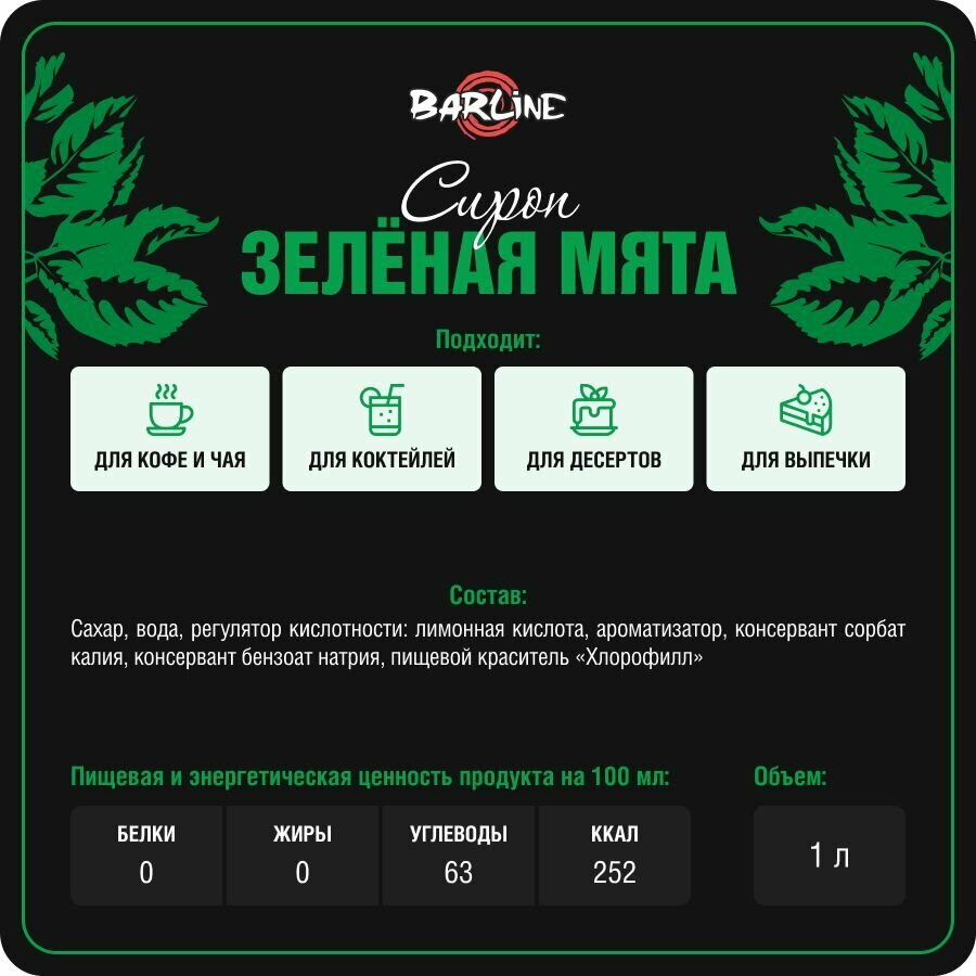 Купить Сироп Barline Зелёная Мята (Green Mint), 1 л, для кофе, чая, коктейлей и десертов, ПЭТ