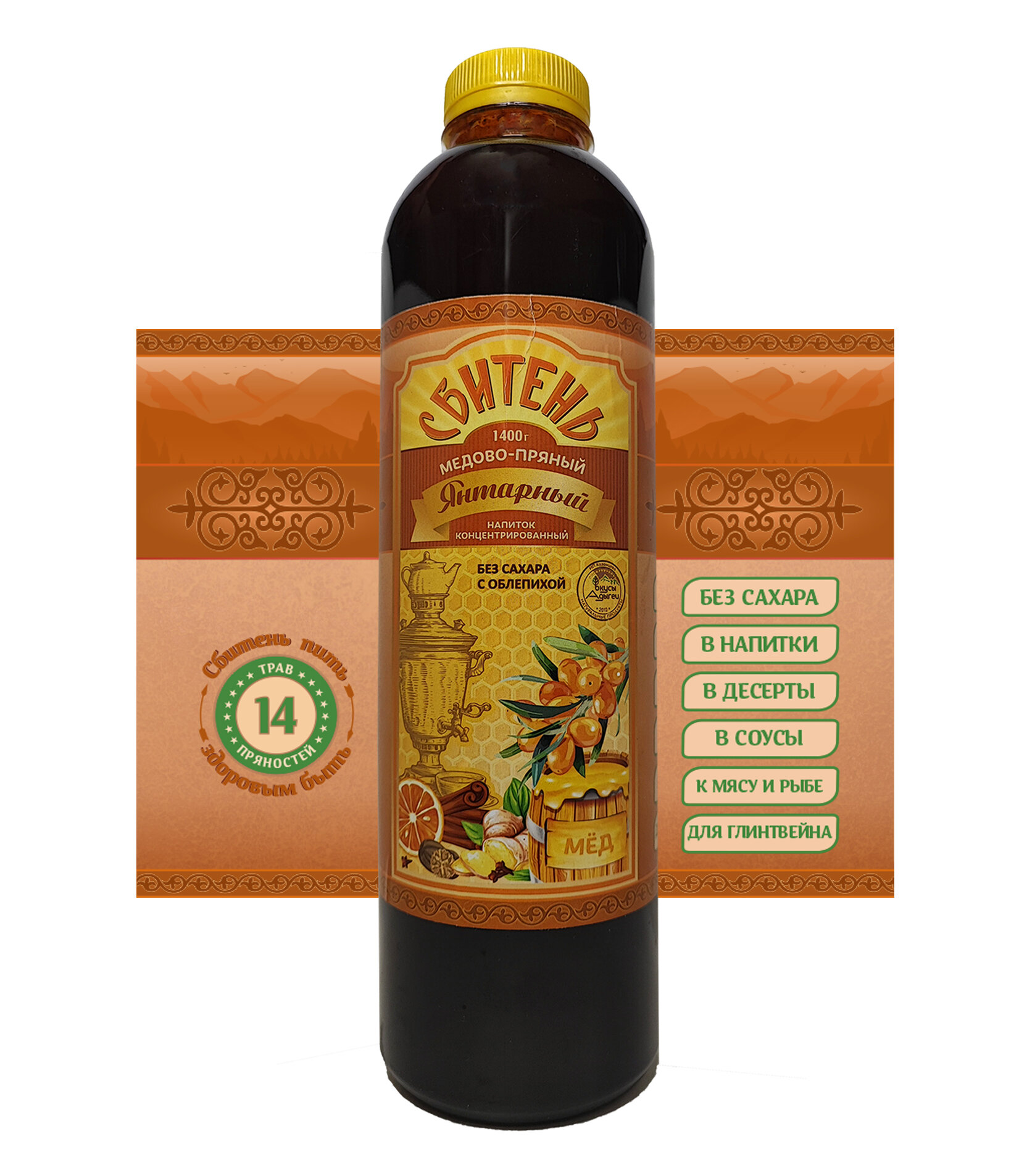 Купить Сбитень Янтарный без сахара сироп медовый с облепихой, пряностями и травами Вкусы Адыгеи 1400г