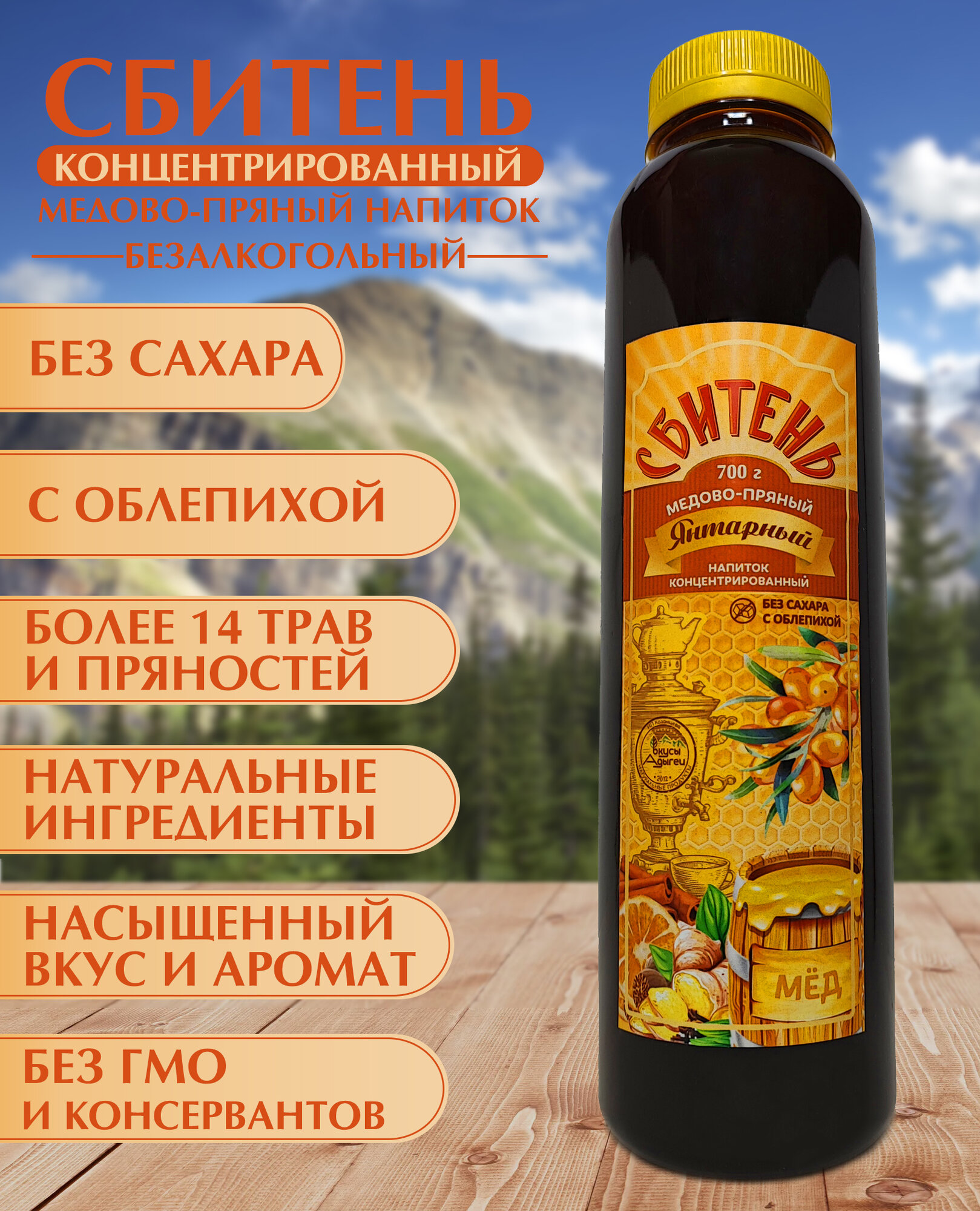 Сбитень Янтарный без сахара сироп медовый с облепихой, пряностями и травами Вкусы Адыгеи 1400г