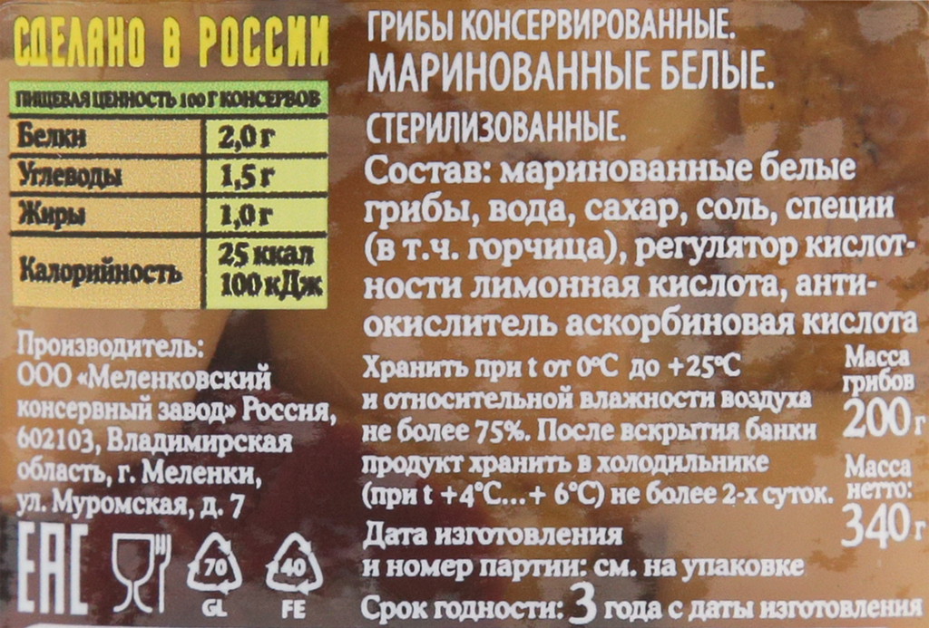 | Состав | маринованные белые грибы, вода, сахар, соль, специи( в т. ч. горчица), лимонная кислота, антиокислитель аскорбиновая кислота |