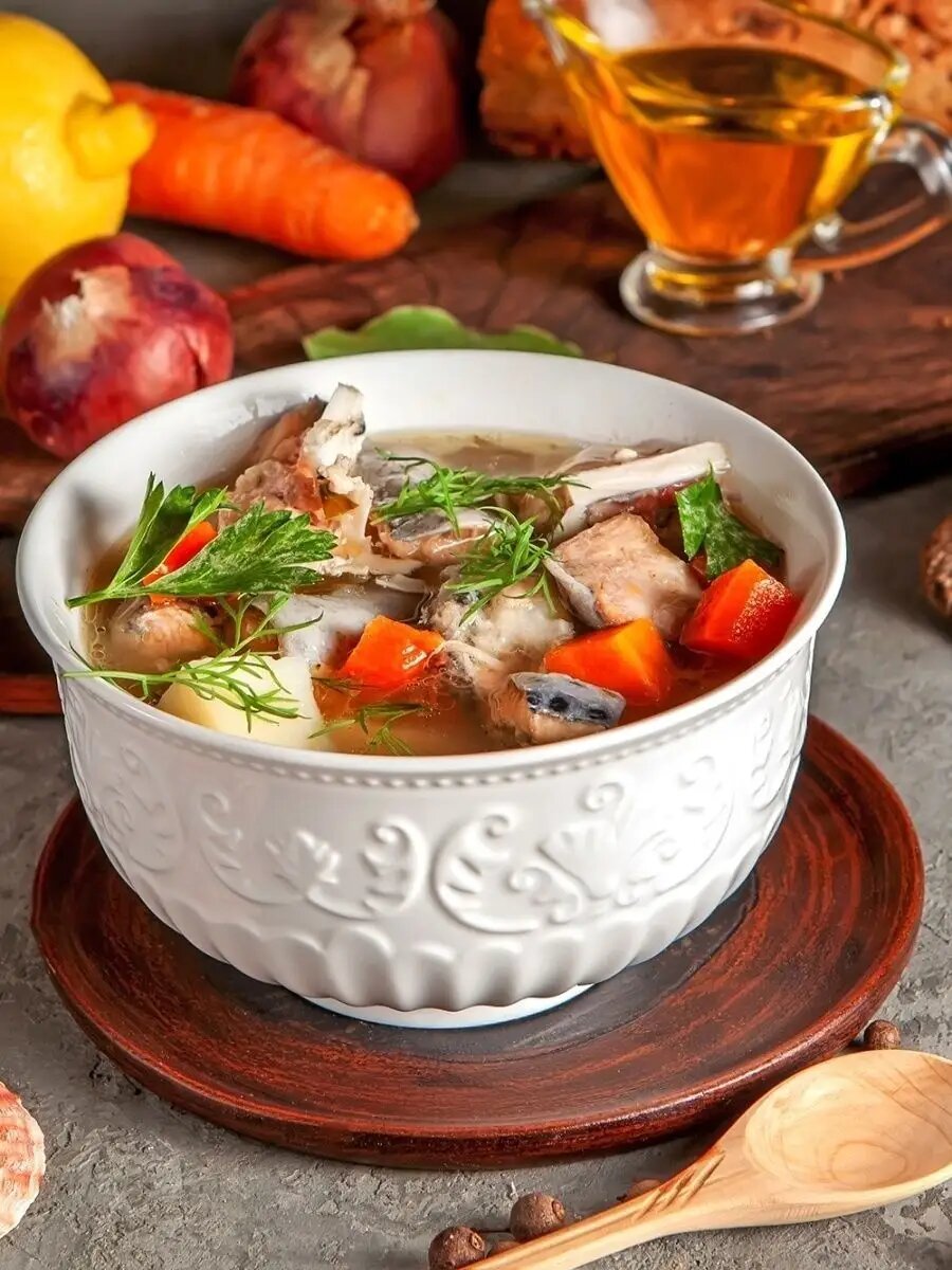 | Состав | голова осетра с мясом, картофель, морковь, зеленый укроп, зеленая петрушка, зеленый перец, зеленый лук, лук репчатый, черный перец, лавровый лист, растительное масло, соль, вода |