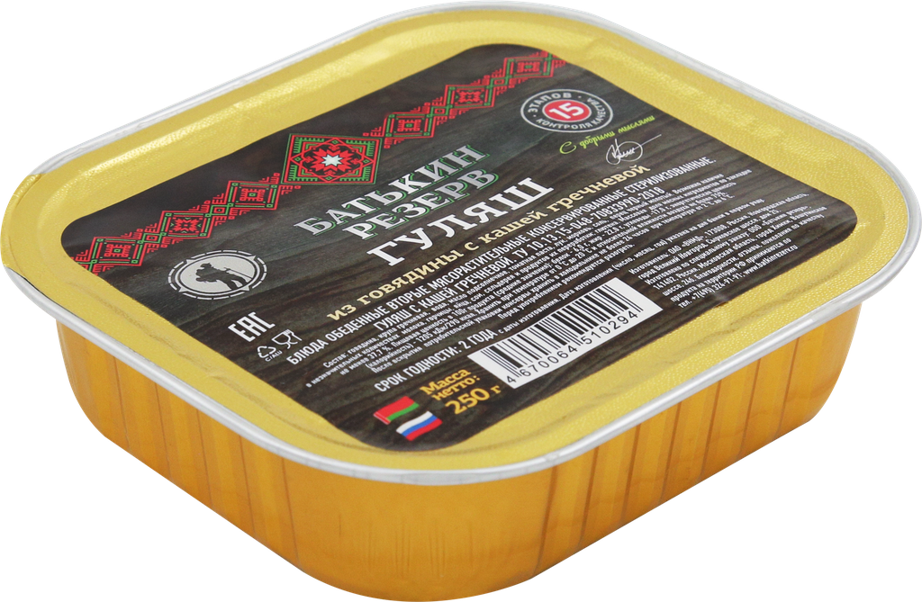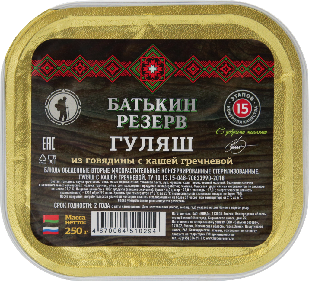 Гуляш из говядины с кашей гречневой, Батькин резерв, ТУ, ламистер, 1 шт. по 250 г
