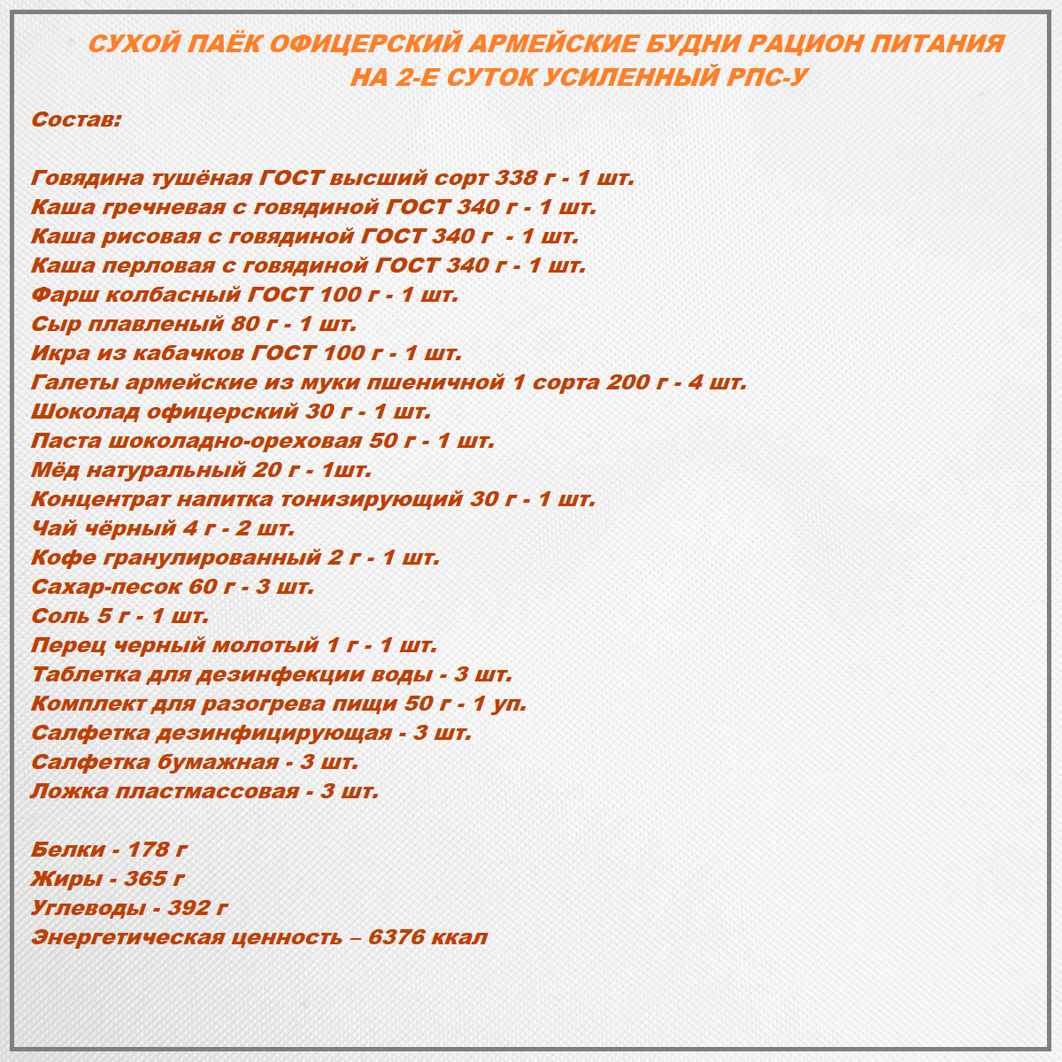 | Состав | Говядина тушёная ГОСТ высший сорт 338 г - 1 шт. Каша гречневая с говядиной ГОСТ 340 г - 1 шт. Каша рисовая с говядиной ГОСТ 340 г - 1 шт. Каша перловая с говядиной ГОСТ 340 г - 1 шт. Фарш колбасный ГОСТ 100 г - 1 шт. Сыр плавленый 80 г - 1 шт. Икра из кабачков ГОСТ 100 г - 1 шт. Галеты армейские из муки пшеничной 1 сорта 200 г - 4 шт. Шоколад офицерский 30 г - 1 шт. Паста шоколадно-ореховая 50 г - 1 шт. Мёд натуральный 20 г - 1шт. Концентрат напитка тонизирующий 30 г - 1 шт. Чай черный 4 г - 2 шт. Кофе гранулированный 2 г - 1 шт. Сахар-песок 60 г - 3 шт. Соль 5 г - 1 шт. Перец черный молотый 1 г - 1 шт. Таблетка для дезинфекции воды - 3 шт. Разогреватель портативный (3 таблетки сухого спирта,металлический таганок) 50 г - 1 уп. Комплект спички водо-ветроустойчивые (6 шт) - 1 уп. Салфетка дезинфицирующая - 3 шт. Салфетка бумажная - 3 шт. Ложка пластмассовая - 3 шт. |