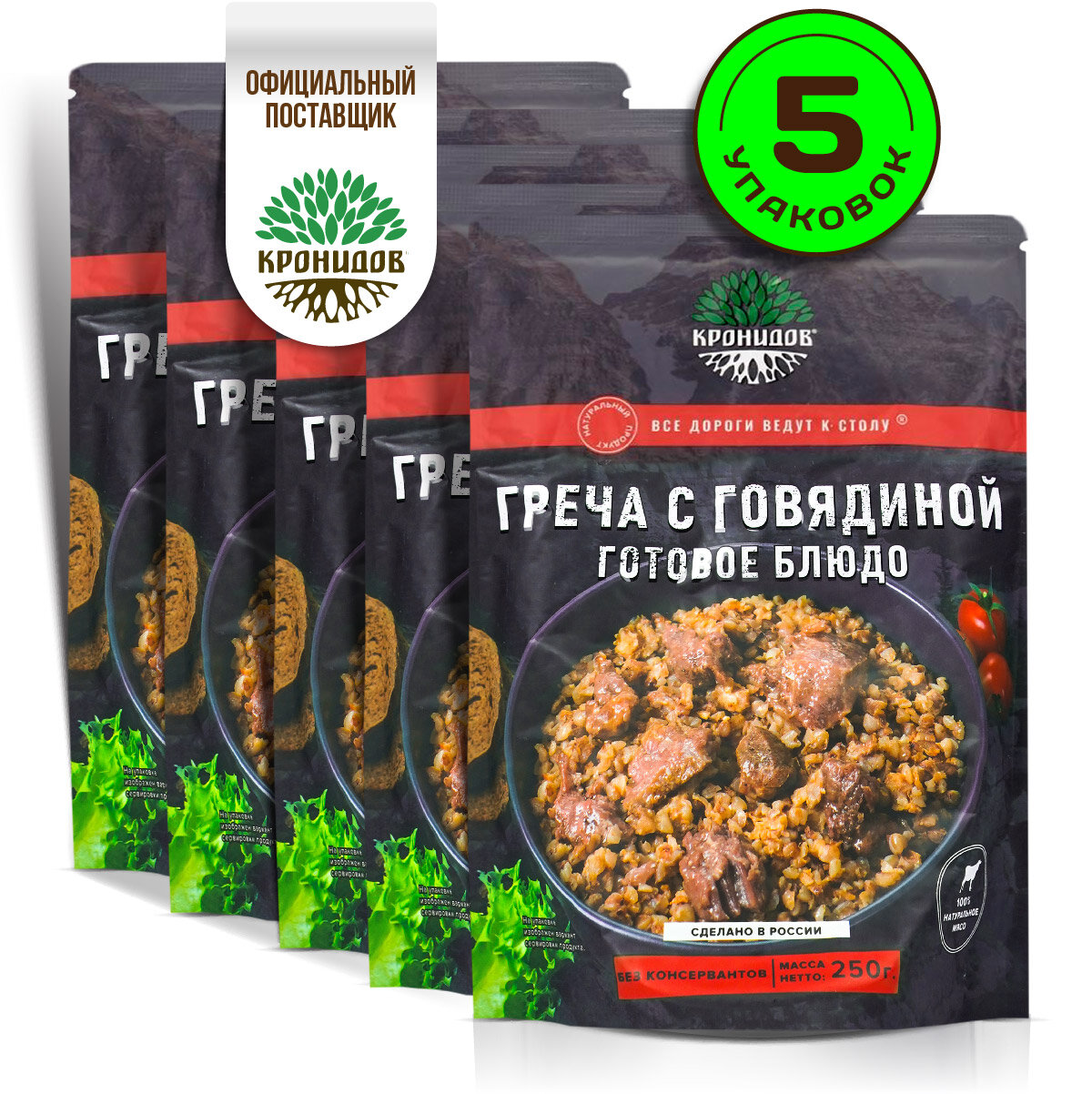 Купить Готовое натуральное блюдо в фольге "Греча с говядиной" Кронидов Сухой паек для охоты, рыбалки, в поход Набор 5 шт. по 250 гр.