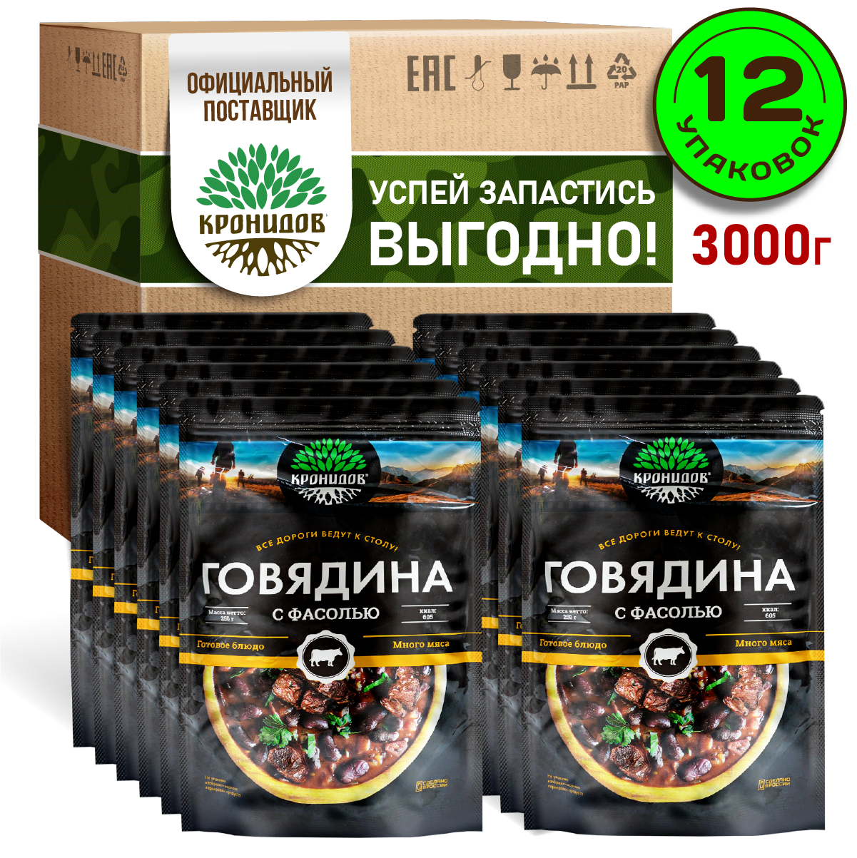 Купить Готовое натуральное блюдо в реторт-пакете "Говядина с фасолью" Кронидов. Сухой паек для охоты, рыбалки, в поход Набор 12 шт. по 250 гр.