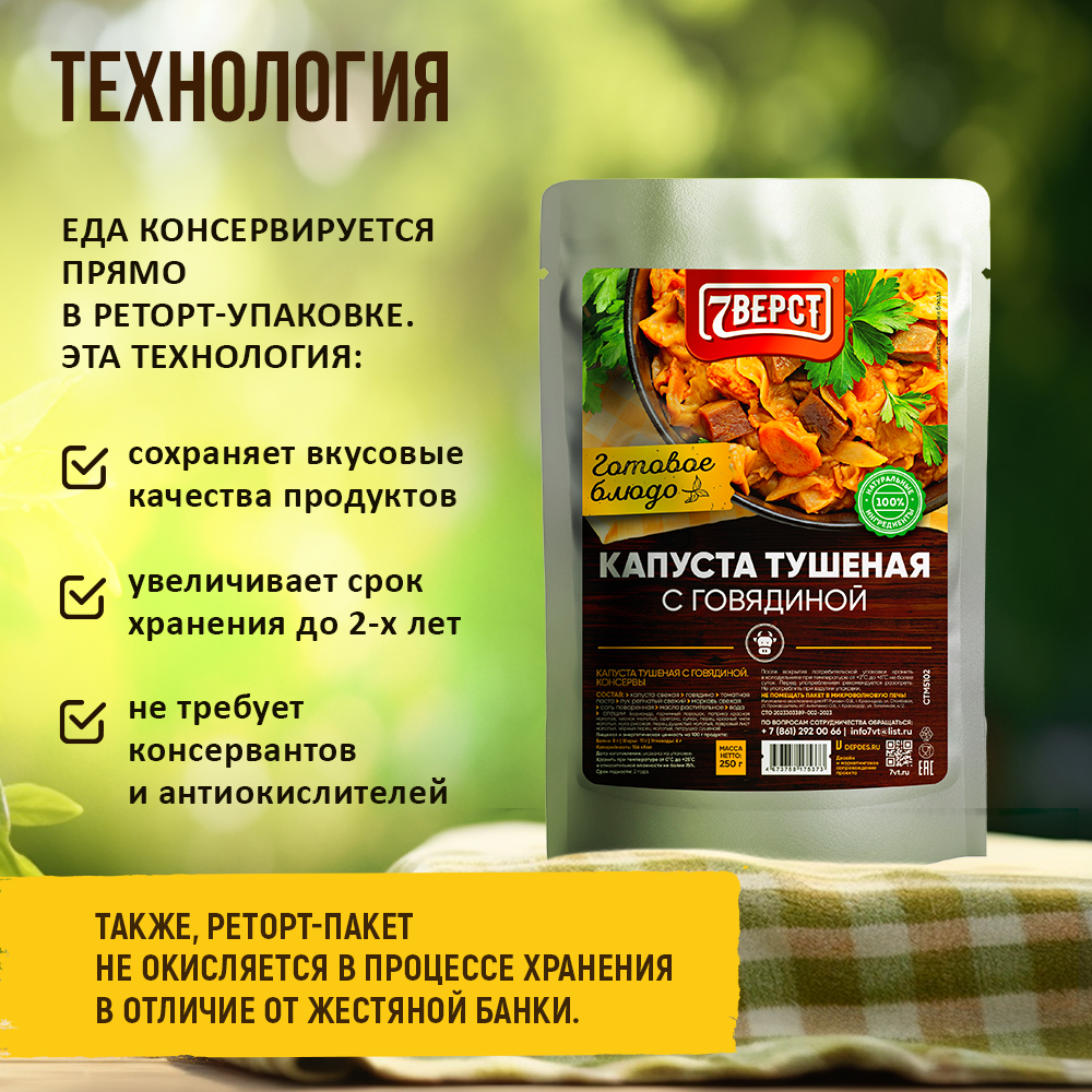 Купить 7 вёрст Говядина с тушеной капустой. Готовая еда в реторт-пакете. Консерва в фольге 250 г